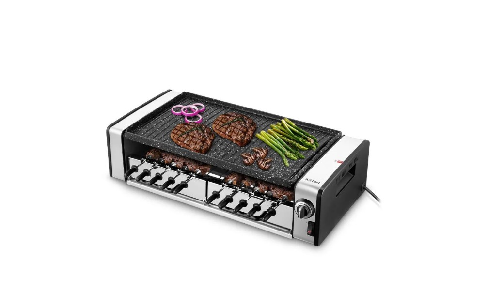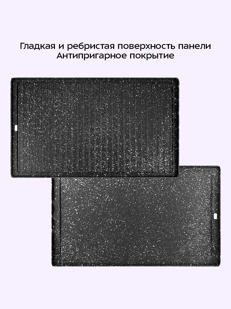 Электрогриль-шашлычница оснащён двухсторонней панелью гриля: поверхность с одной стороны ребристая, с другой — гладкая. На обе стороны нанесено антипригарное покрытие, что позволяет готовить на электрогриле-шашлычнице с минимальным количеством масла.