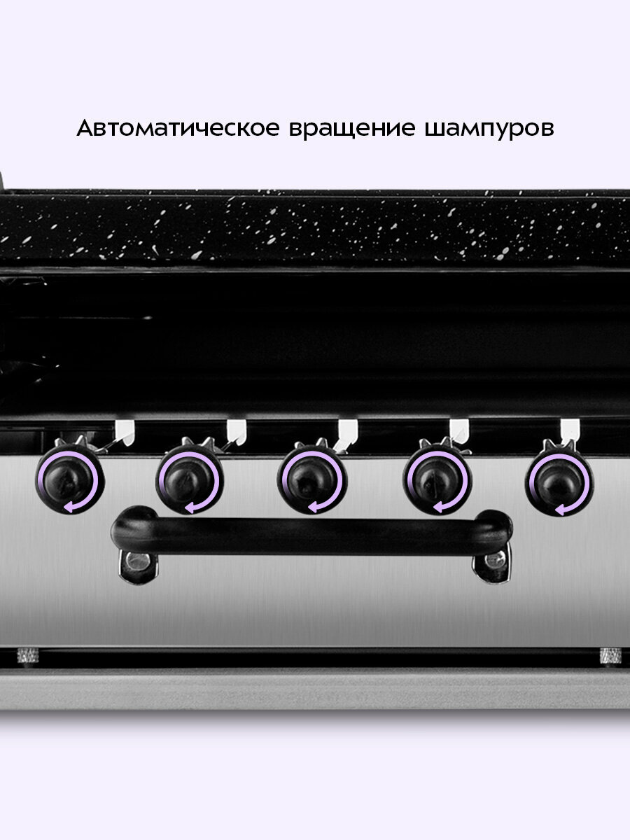 Прибор оснащён автоматическим механизмом вращения шампуров. Вращательный механизм находится в передней части поддонов. Это очень удобно, так как для приготовления шашлыков вам больше не придётся самостоятельно следить за равномерным приготовлением мяса.