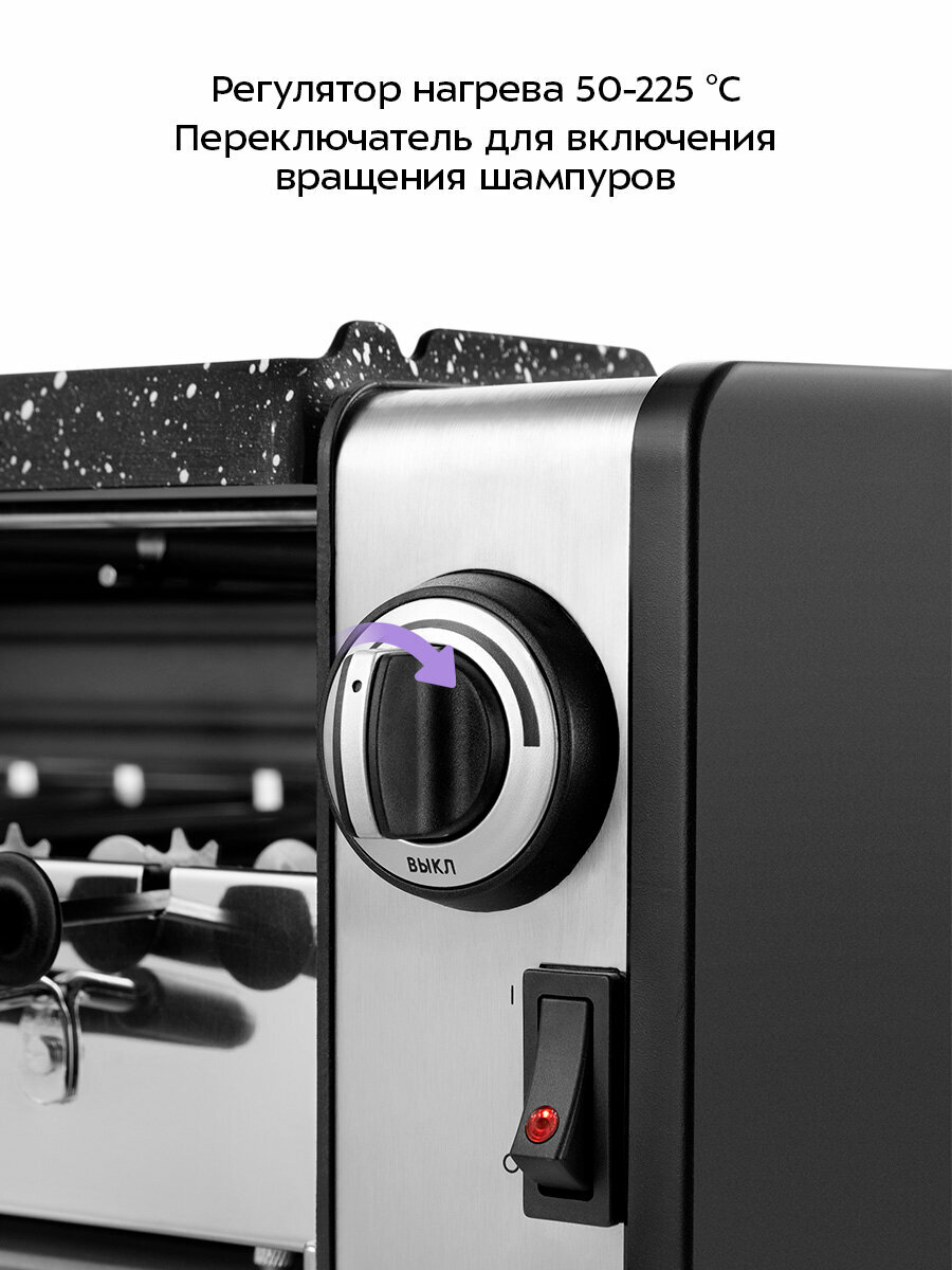 Прибор оснащён регулятором, благодаря которому вы можете плавно отрегулировать необходимый уровень нагрева 50-225 °C. Переключатель включает и выключает вращение шампуров.