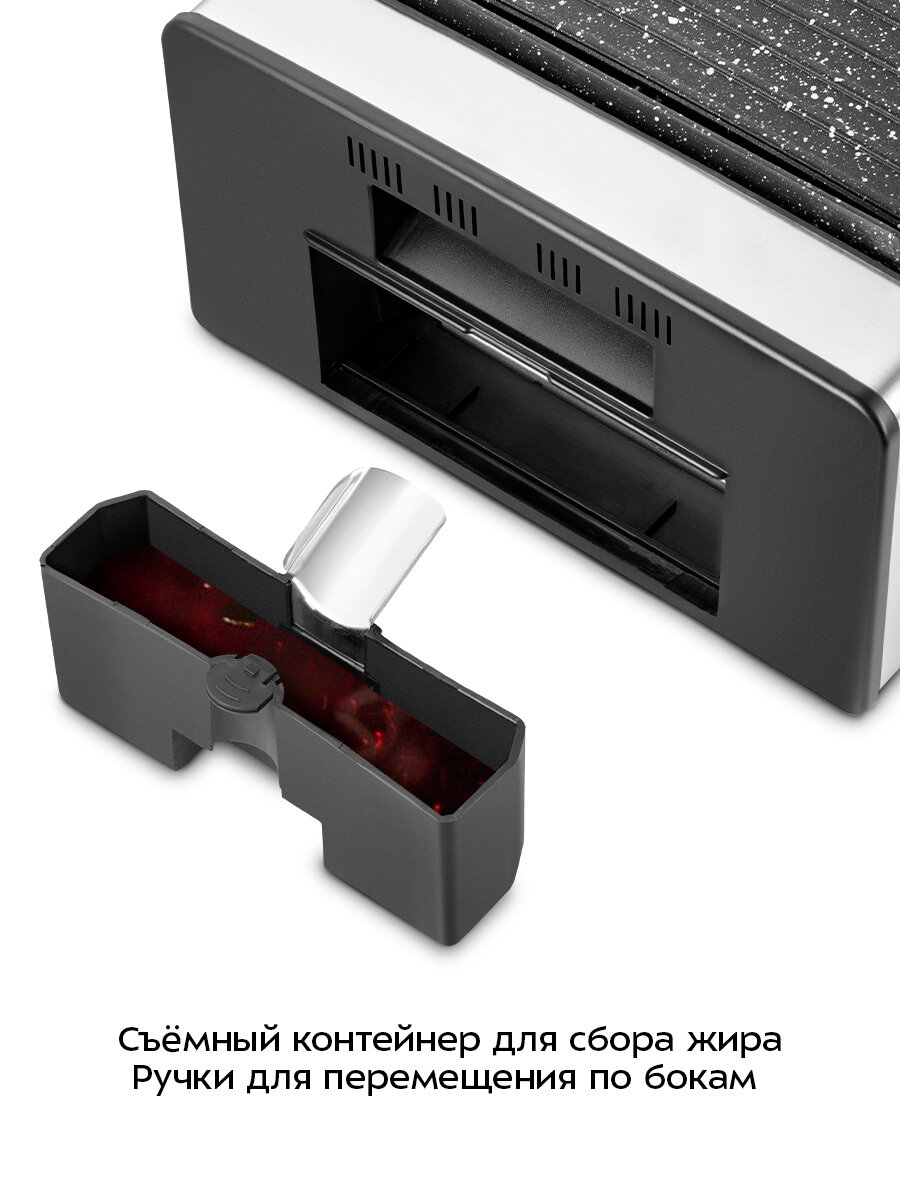 Данная модель оснащена съёмным контейнером для сбора жира и сока, которые выделяются в процессе приготовления. Специальные ручки по бокам устройства позволяют удобно перемещать его. Также по бокам расположены вентиляционные отверстия.