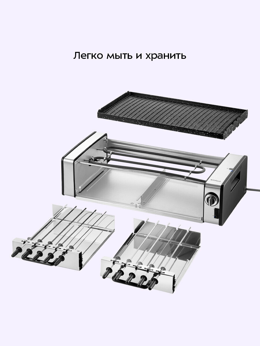 Поддоны у прибора съёмные, что облегчает задачу достать горячие шашлыки. Во время приготовления шашлыков жир и сок стекают в поддон, что облегчает уход за устройством. В комплект входят 10 шампуров.