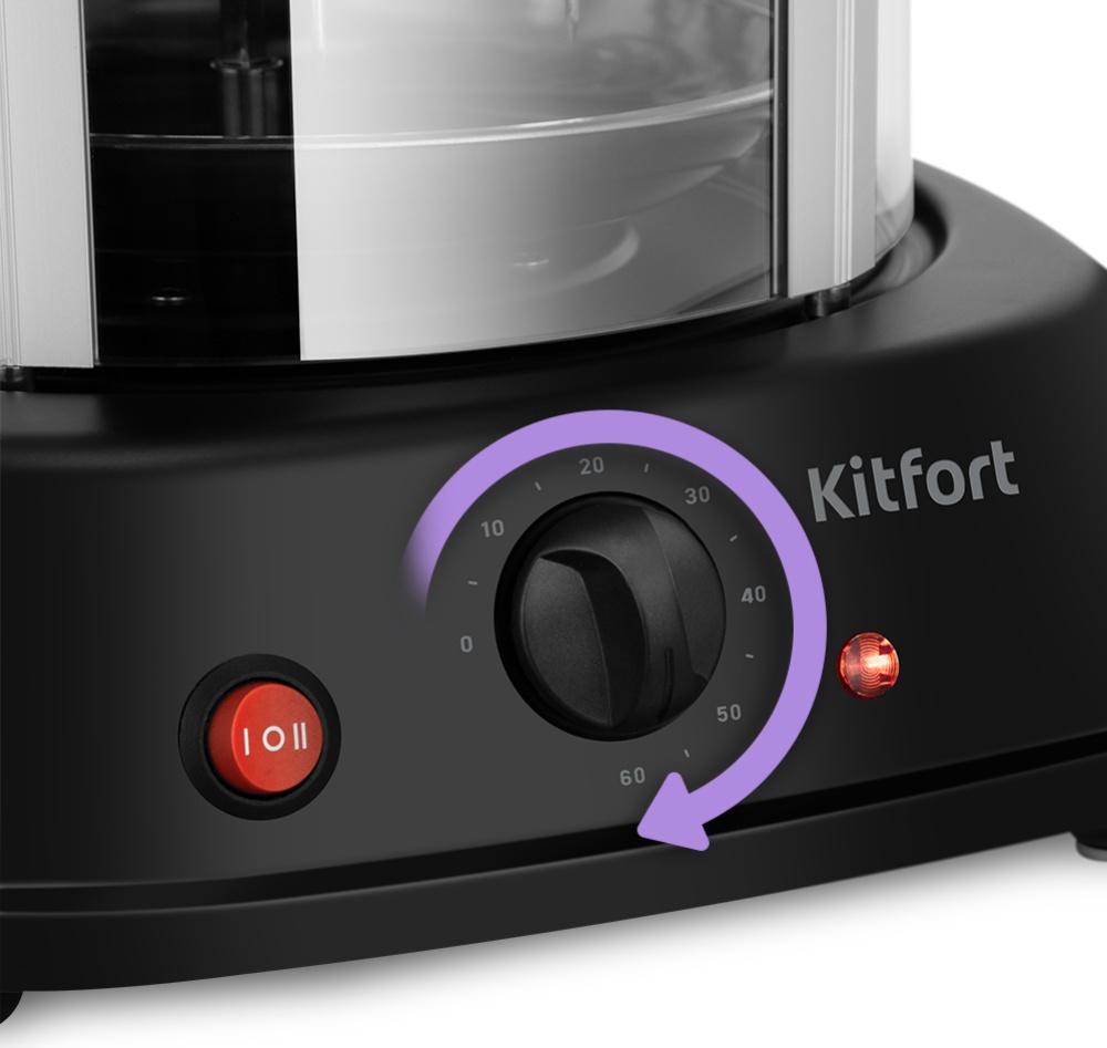 Переключатель служит для выбора уровня нагрева или выключения нагрева. Регулятор позволяет установить таймер до 60 минут. Поворот регулятора по часовой стрелке увеличивает значение таймера, поворот против часовой стрелки — уменьшает.