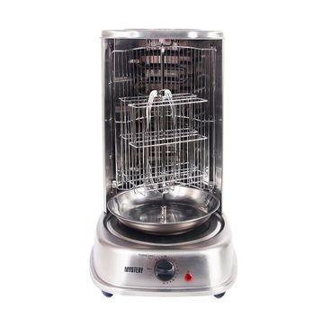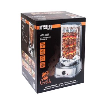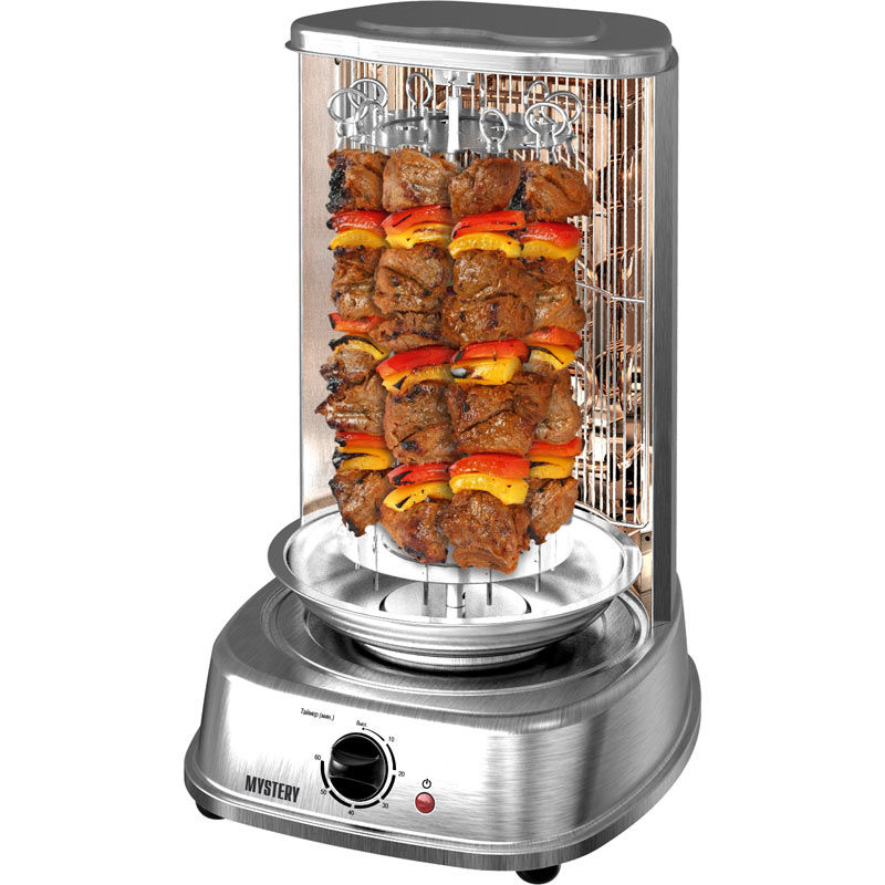 7 шампуров из нержавеющей стали медленно вращаются, обеспечивая равномерную обжарку. Под шампурами расположена металлическая чаша для сбора стекающего жира.
