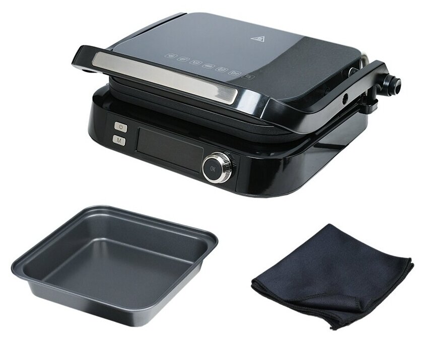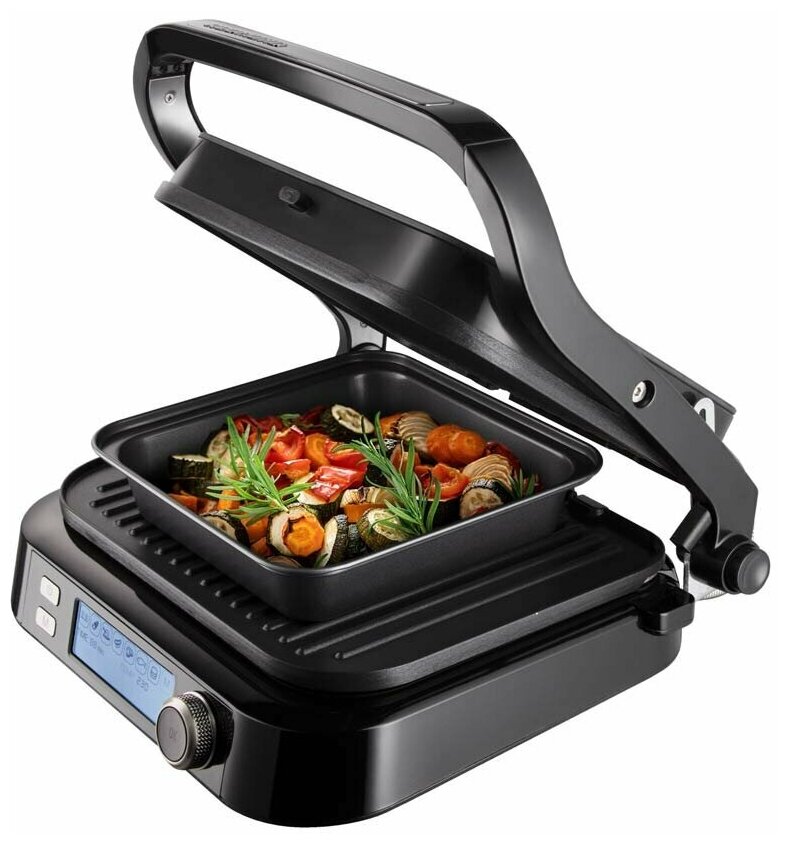 SteakMaster RGM-G850P — мощный универсальный прибор 3 в 1, который работает как прижимной гриль, компактный духовой шкаф и барбекю-жаровня. С его помощью сытные блюда, десерты и выпечка приготовятся в два раза быстрее, чем на обычной плите. Модель выполнена в стиле дизайнерской серии Chrome&Black: лаконичный черный корпус дополнен хромированными деталями, глянцевая крышка прибора выполнена из черного закаленного стекла.