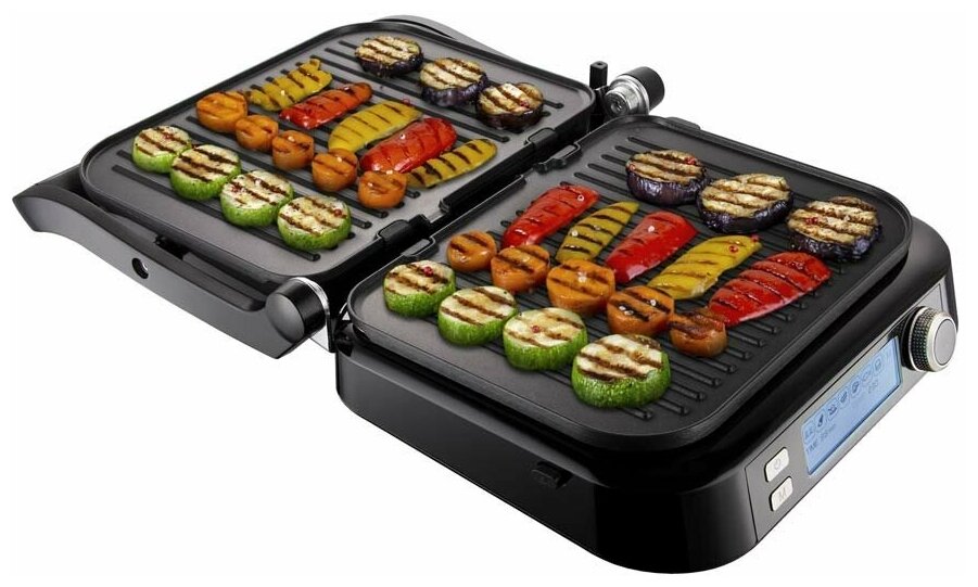 Раскройте крышку прибора на 180°, чтобы готовить блюда барбекю одновременно на двух панелях. На одной стороне поджарьте нарезанное куриное филе или рыбные медальоны, на другой — кусочки сладкого перца, картофеля и грибов. Такое угощение придется по вкусу всем!