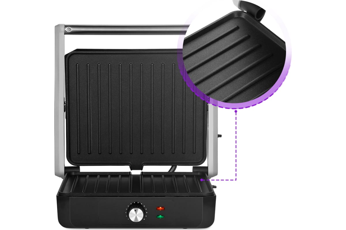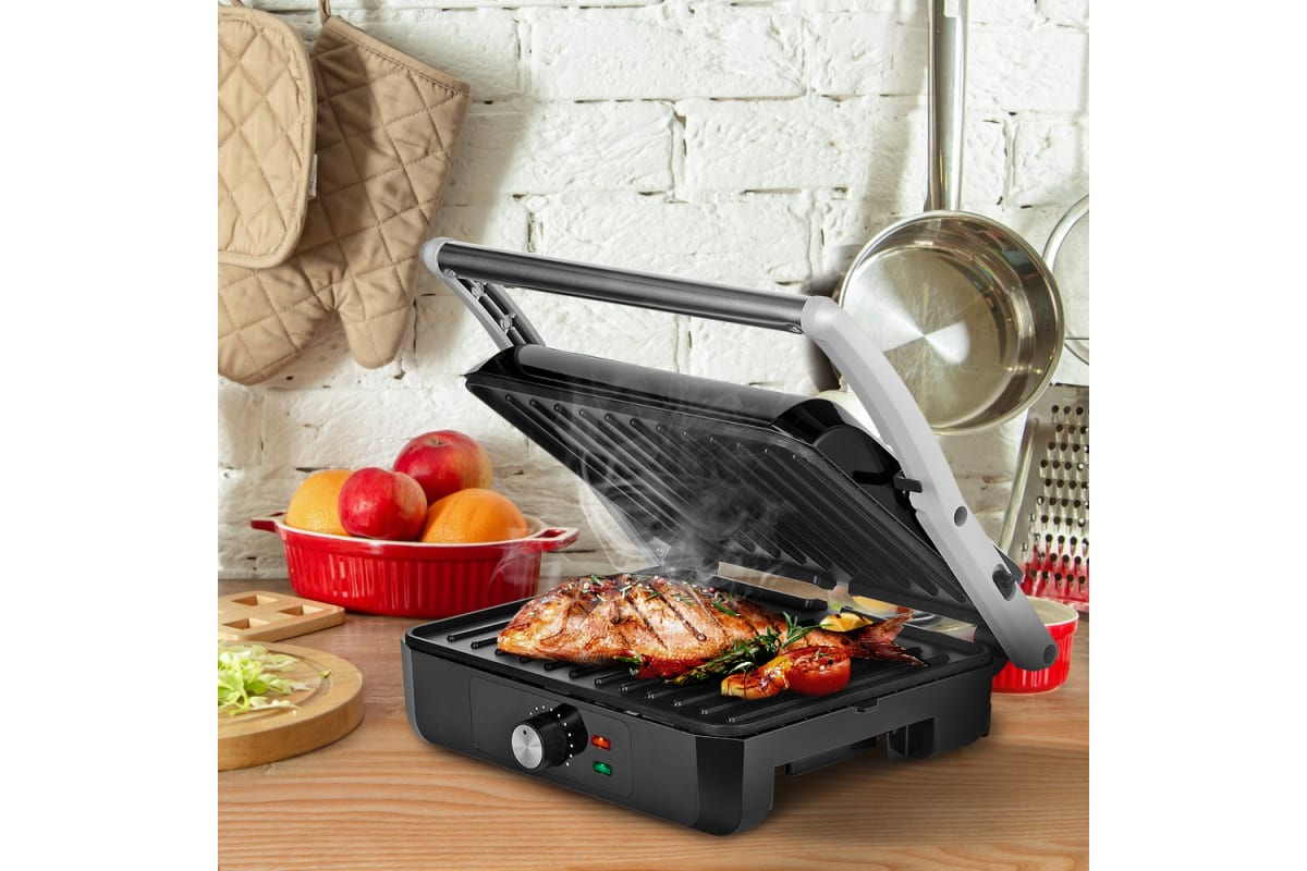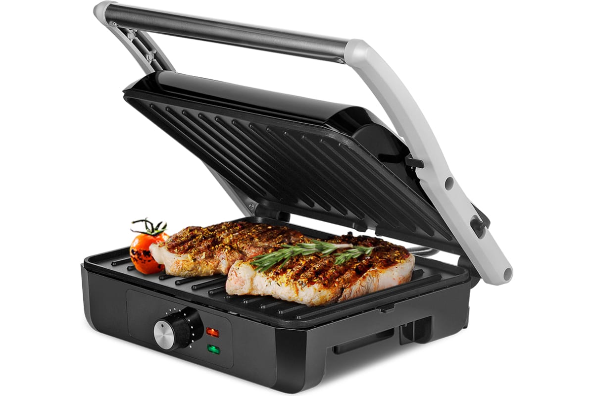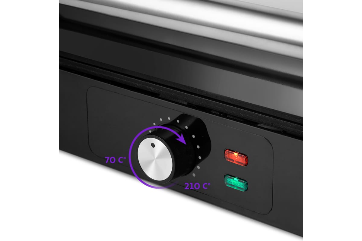 Гриль оснащен термостатом для поддержания температуры панелей, а также индикаторами питания и нагрева. С помощью регулятора температуры вы сможете плавно менять температуру приготовления.