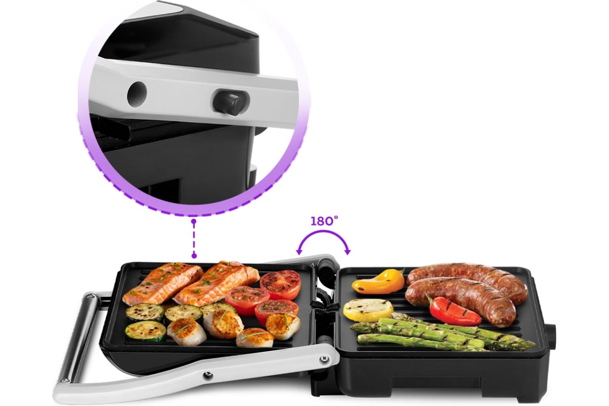 Специальный фиксатор сбоку гриля удерживает крышку в закрытом положении, что делает готовку, транспортировку и хранение более удобными.