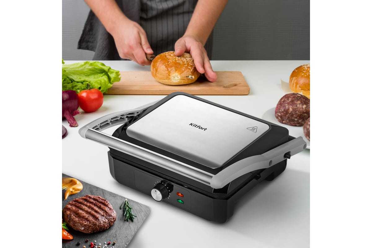 Электрогриль КТ-3633 предназначен для приготовления мяса, рыбы, овощей, сосисок, бутербродов, панини, сэндвичей, гренок, тостов и многих других блюд.