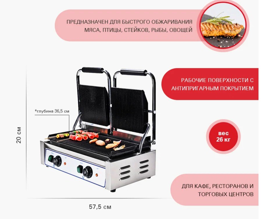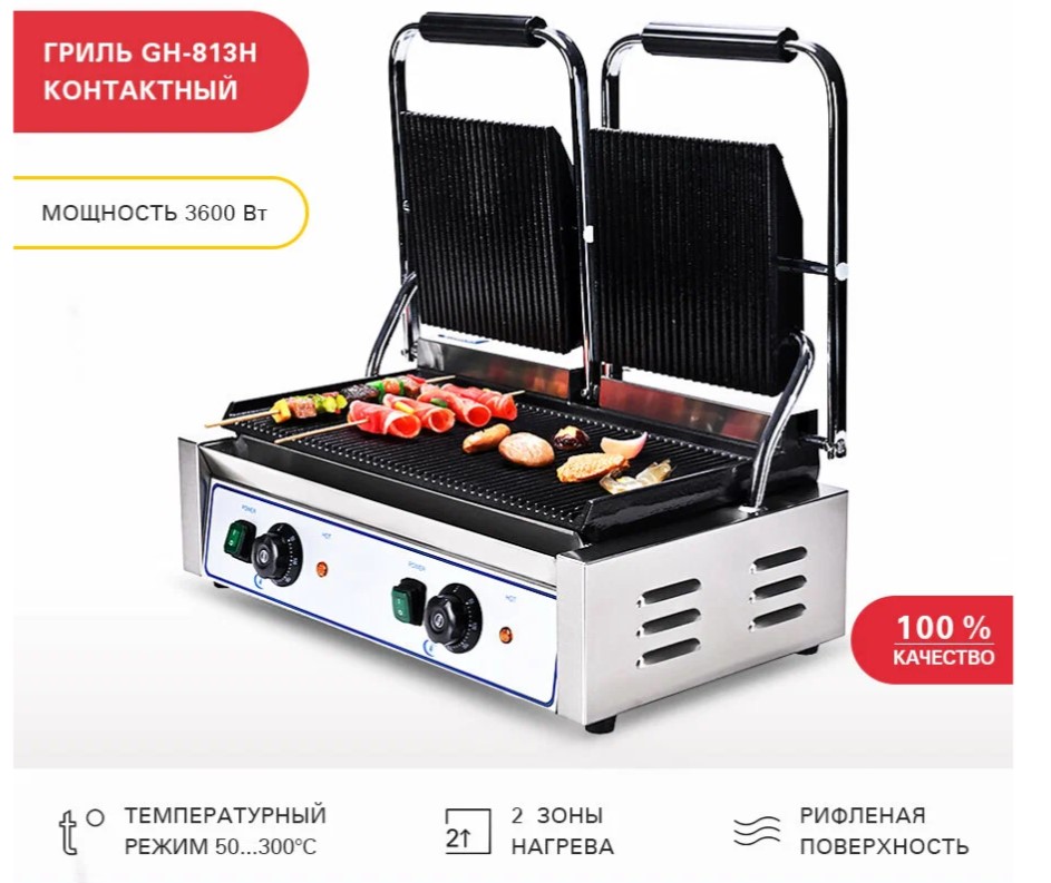 Контактный гриль Viatto GH-813H 63392 используется в ресторанах, кафе, заведениях быстрого питания для обжаривания мяса, рыбы и овощей, приготовления различных сендвичей.