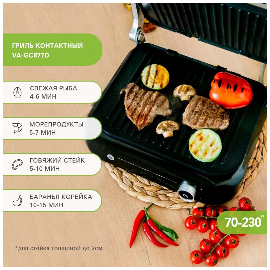 Контактный гриль Viatto VA-GC877D 163411 предназначен для жарки мяса, рыбы, овощей.