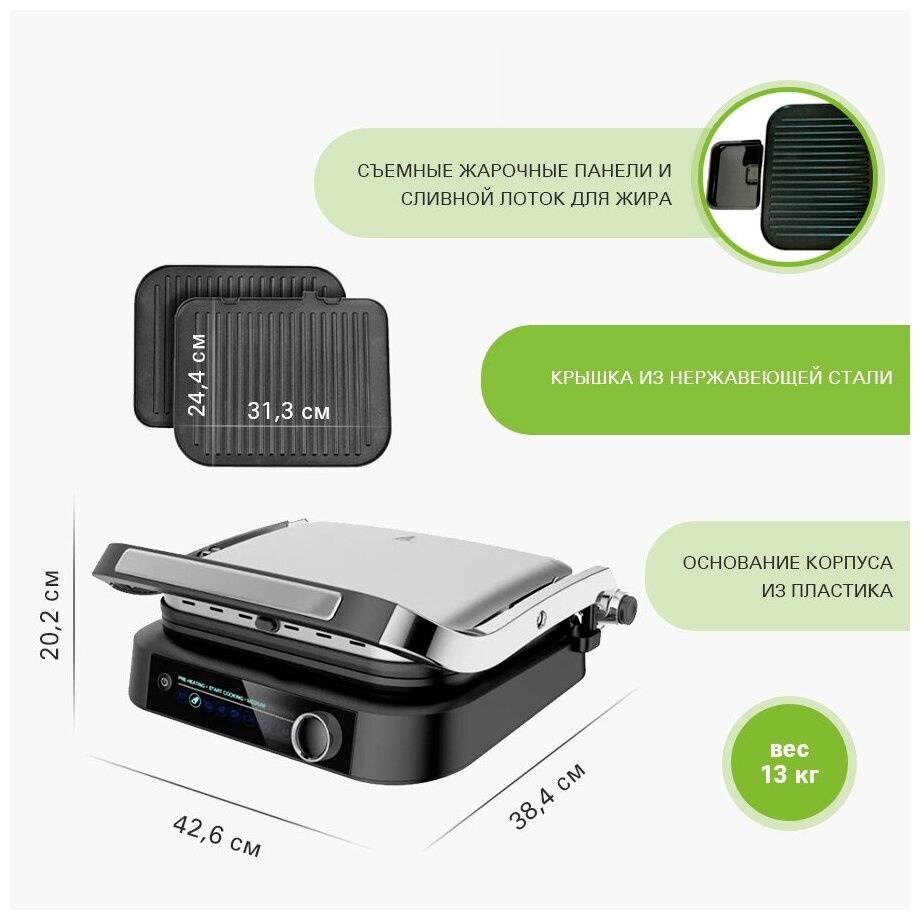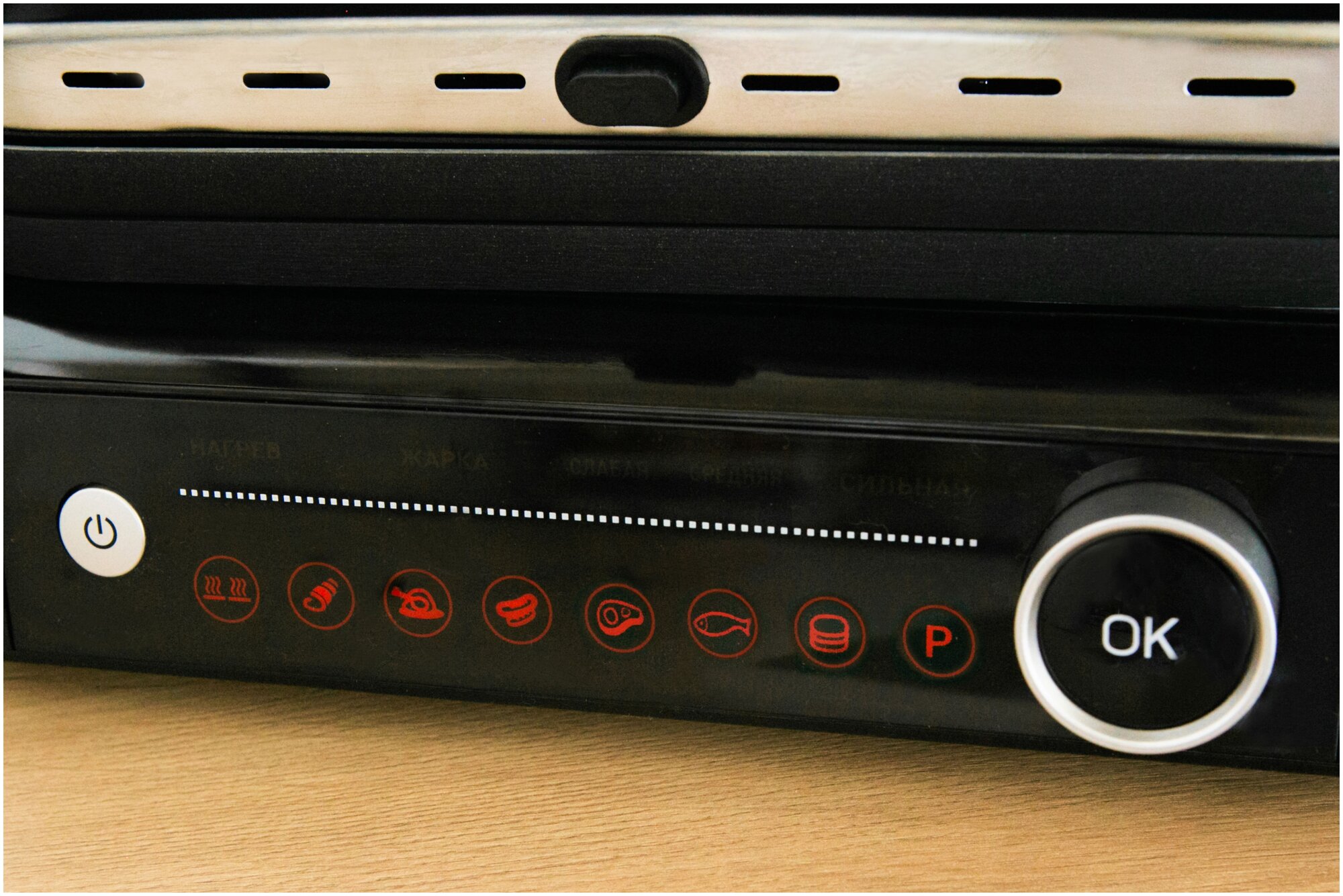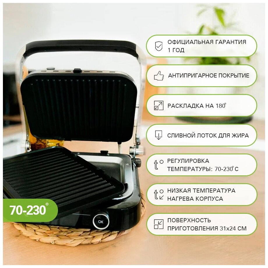 Антипригарное покрытие поверхностей электрического гриля позволяет готовить без использования масла. Идеально подходит для приготовления сочных стейков, горячих сэндвичей и бутербродов.