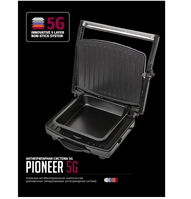 Стейки, колбаски и рыба часто пригорают на гриле? Вкусная аппетитная корочка остается на пластинах? Пригоревший гриль сложно отмыть? Не отчаивайтесь! Ваша проблема уже решена! Воспользуйтесь электрическим грилем Pioneer с системой антипригарного покрытия 5G. За экологичность, надежность, выдающиеся антипригарные свойства и инертность к пищевым продуктам здесь отвечает ни 2, ни 3, а целых 5 слоев. Перечислим их от верхнего до нижнего.