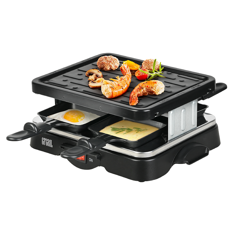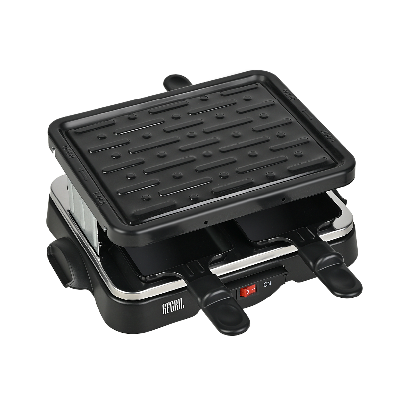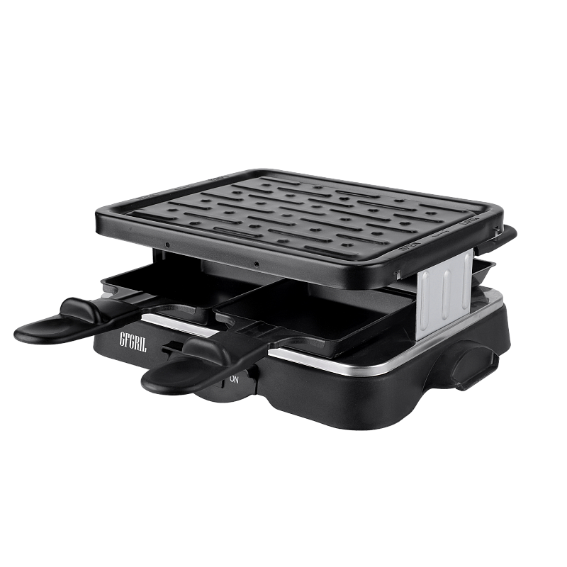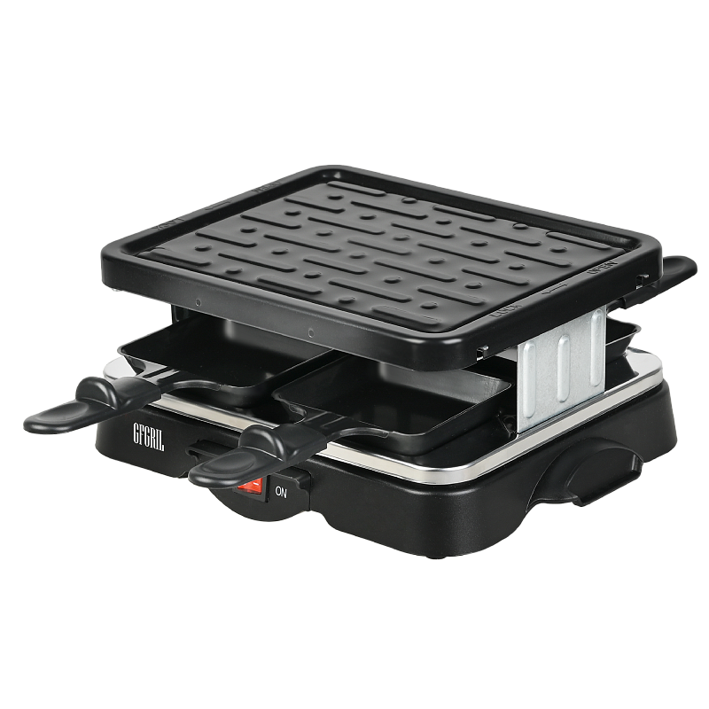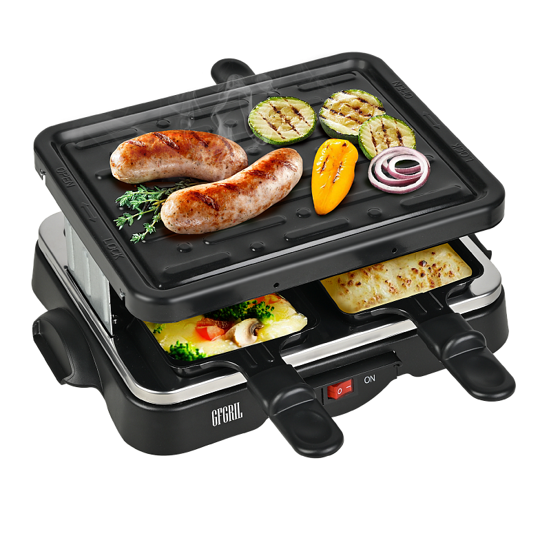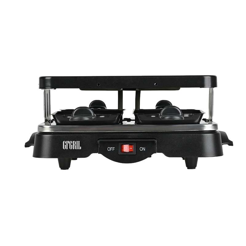 Электрический гриль раклетница GF-015 компактного размера - это универсальное кухонное устройство, которое позволяет приготовить несколько разнообразных блюд одновременно. Мини гриль электрический идеально подходит для приготовления сыра раклет, мяса, птицы, морепродуктов, овощей и омлетов. Электрический гриль-раклетница GF-015 имеет два яруса: на нижнем ярусе располагаются 4 порционные сковородки, температура нагрева 190 С, а на верхнем – антипригарная панель для жарки, размером 22*17,5 см с температурой нагрева 230 С. Вы можете готовить раклет в порционных сковородках, а на пластине для гриля обжаривать другие продукты одновременно. В комплект входят также 4 деревянные лопатки, которые помогут Вам вынимать и переворачивать блюда без повреждений.