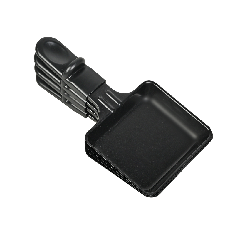 Корпус раклетницы, Пластина для гриля с антипригарным покрытием, Порционные сковородки (4 шт), Деревянные лопатки (4 шт), Книга рецептов.