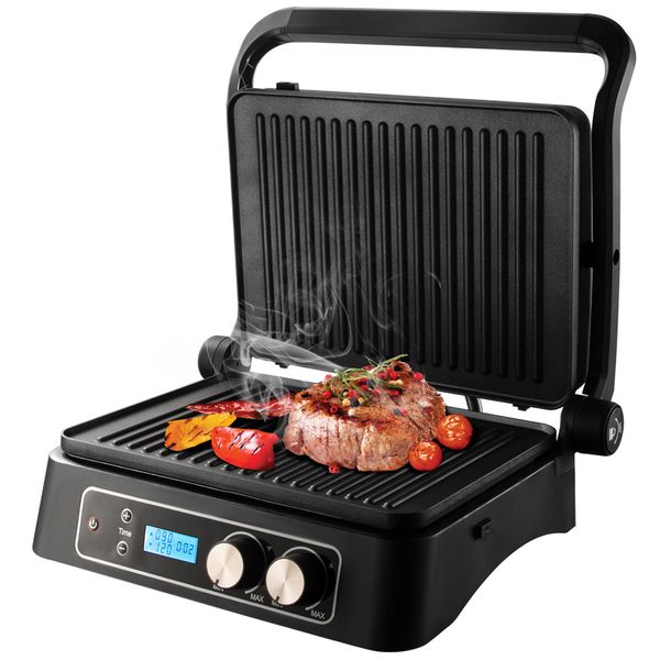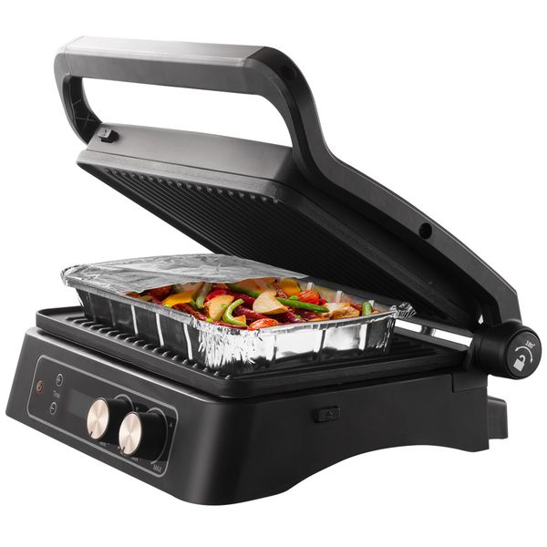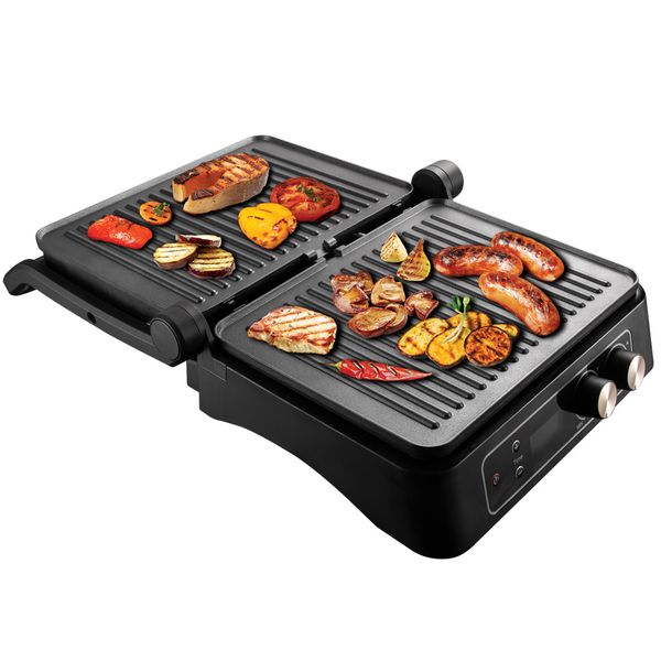 - Разложите прибор на 180°, и обжаривайте ломтики мяса, птицы, овощей, сыра и фруктов сразу на двух панелях, как на барбекю-жаровне.
