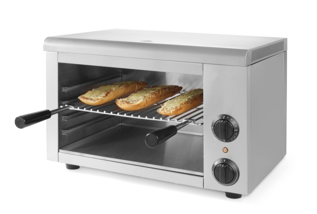 Гриль-саламандра Gastrorag AT-938E – это техника для приготовления блюд на профессиональной кухне. Электрический гриль саламандер для кафе относится к бесконтактному типу и имеет только верхний нагрев, который осуществляется металлическим нагревательным элементом. Электрогриль предназначен для запекания, доготовки блюд, придания им аппетитной золотистой корочки и поддержания в горячем состоянии до момента подачи посетителям. С его помощью можно приготовить курицу, стейки, горячие бутерброды, тосты. Гриль саламандр электрический Gastrorag AT-938E отличается несложной конструкцией и простотой в эксплуатации. Он представляет собой закрытую с 3-х сторон камеру с четырьмя парами направляющих. Продукты размещаются на решетке, а направляющие позволяют регулировать ее высоту относительно нагревательного элемента, тем самым увеличивая или уменьшая интенсивность нагрева. Температура регулируется ручкой термостата в диапазоне 50-300оС. Предусмотрен также 15-минутный таймер. В нижней части камеры располагается съемный поддон для сбора жира и остатков пищи. Корпус гриля электрического открытого изготовлен из нержавеющей стали.