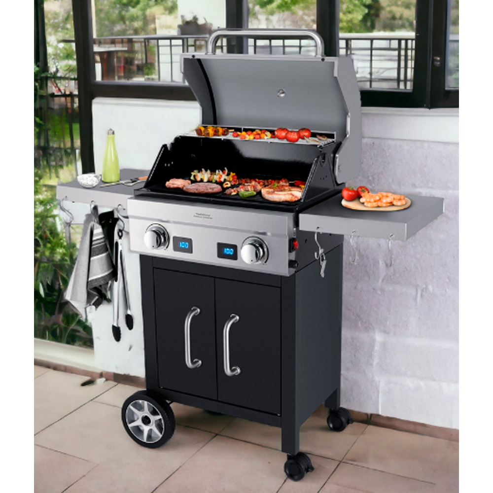 2 области нагрева с индивидуальной регулировкой температуры, общая площадь гриля 54 x 32 см.