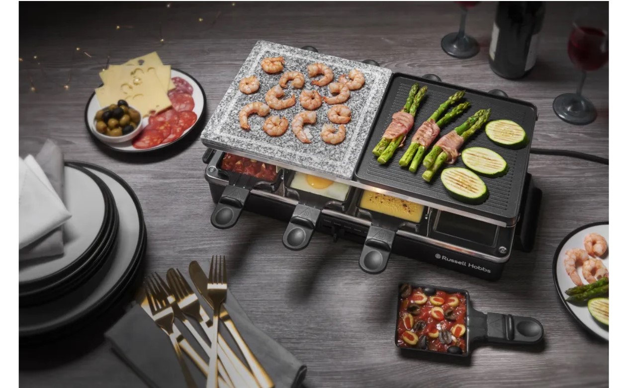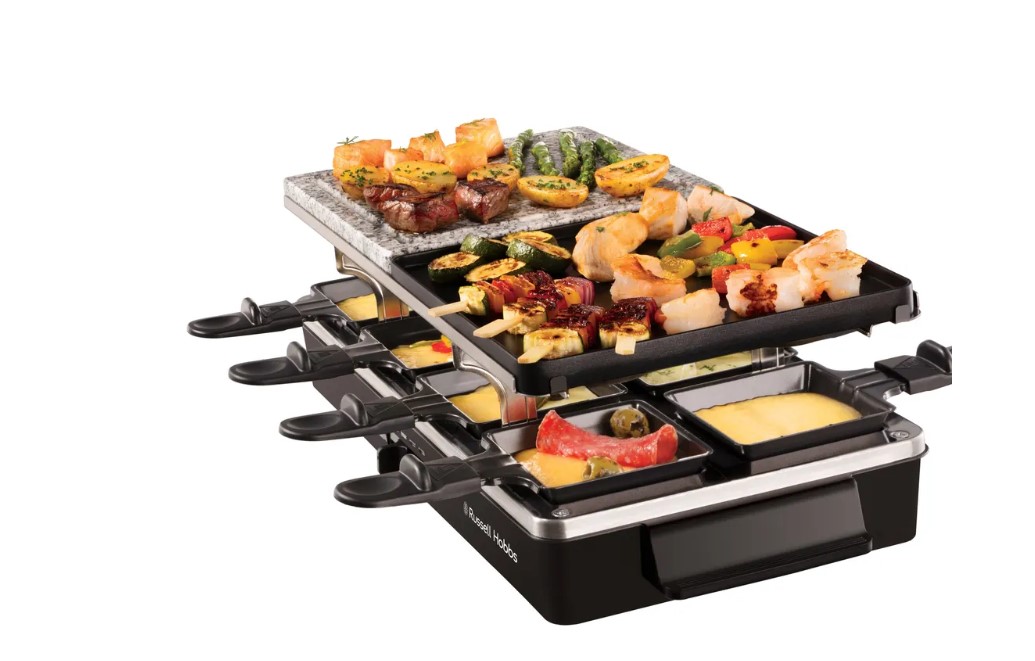 Раклетница — это устройство для приготовления самых разнообразных закусок одновременно, ведь это одновременно универсальный электрогриль, оснащенный камнем для жарки и ребристой антипригарной частью. Семейные обеды или ужин для компании друзей теперь станут еще более приятными, интересными и разнообразными, а главное — совершенно бесхлопотными с раклетницей 3-в-1 для настольного приготовления еды. Просто заготовьте сырые ингредиенты: тесто для блинчиков, кусочки сырого мяса, птицы или рыбы, свежие овощи, а также специи. Ваши гости сами смогут подобрать под себя желаемые продукты и готовить их, не выходя из-за стола. Раклетница придаст особый вкус в сервировке стола, очень удобна и проста в использовании и гарантирует вам удовольствие от совместного приготовления вкусной домашней еды в кругу приятных Вам людей.