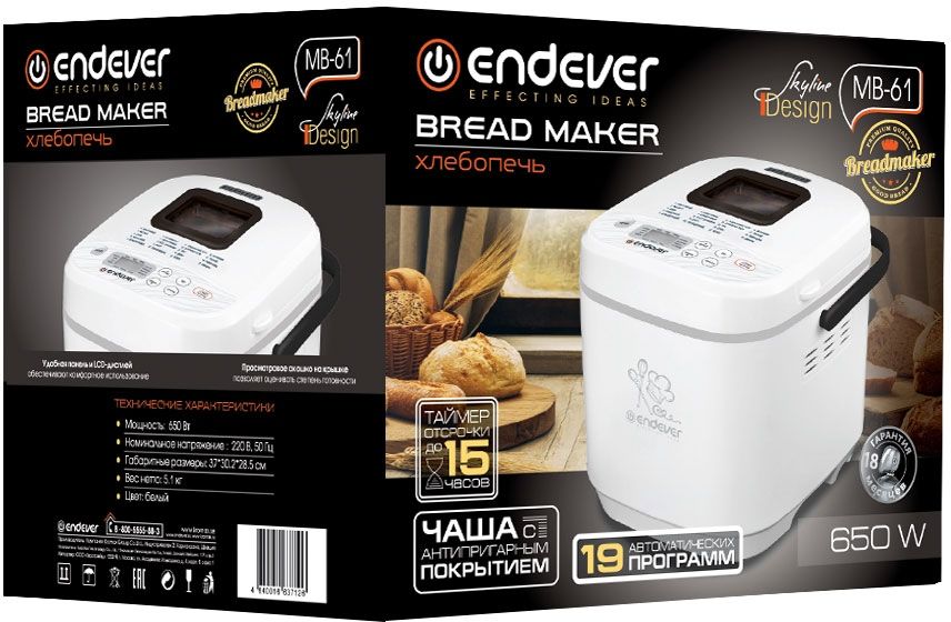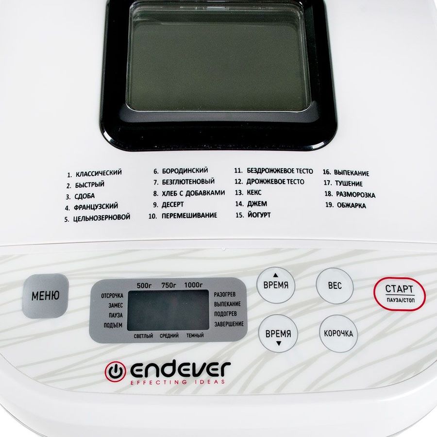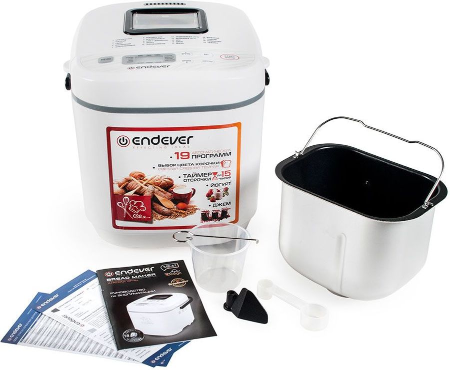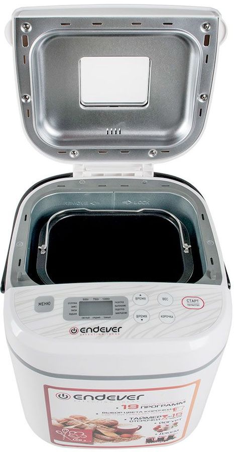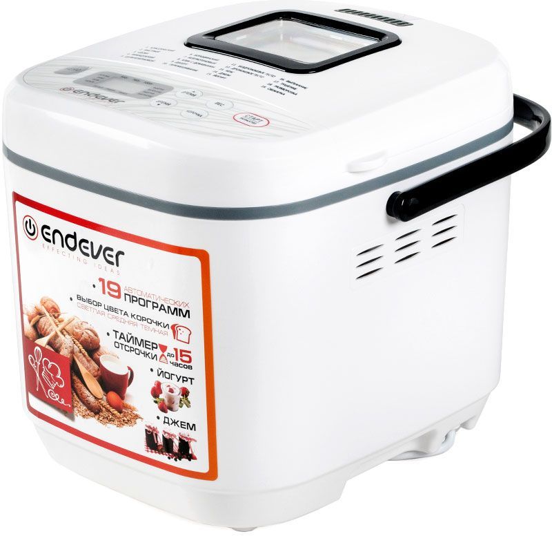 Программы выпечки: Классический, Французский, Цельнозерновой, Бородинский, Быстрый, Сдоба, Безглютеновый, Хлеб с добавками, Десерт, Кекс, Джем, Йогурт, Выпекание, Тушение, Разморозка, Обжарка