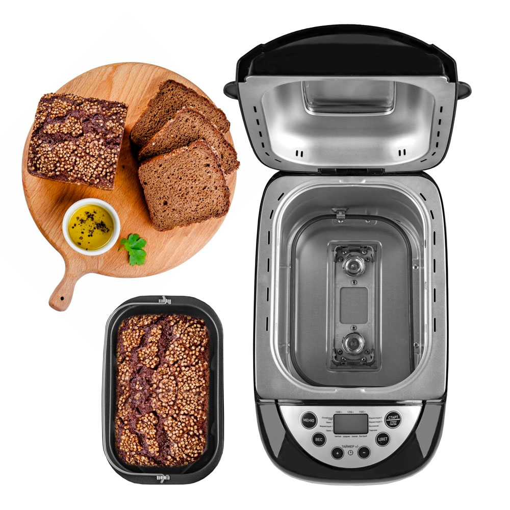 Устройство оснащено LCD-дисплеем для удобного контроля за процессом приготовления, а таймер отложенного старта позволит начать выпекание в удобное для вас время. После окончания работы хлебопечь автоматически переходит в режим поддержания температуры на 60 минут, чтобы ваш хлеб был горячим и свежим. Через удобное смотровое окошко удобно наблюдать за процессом.