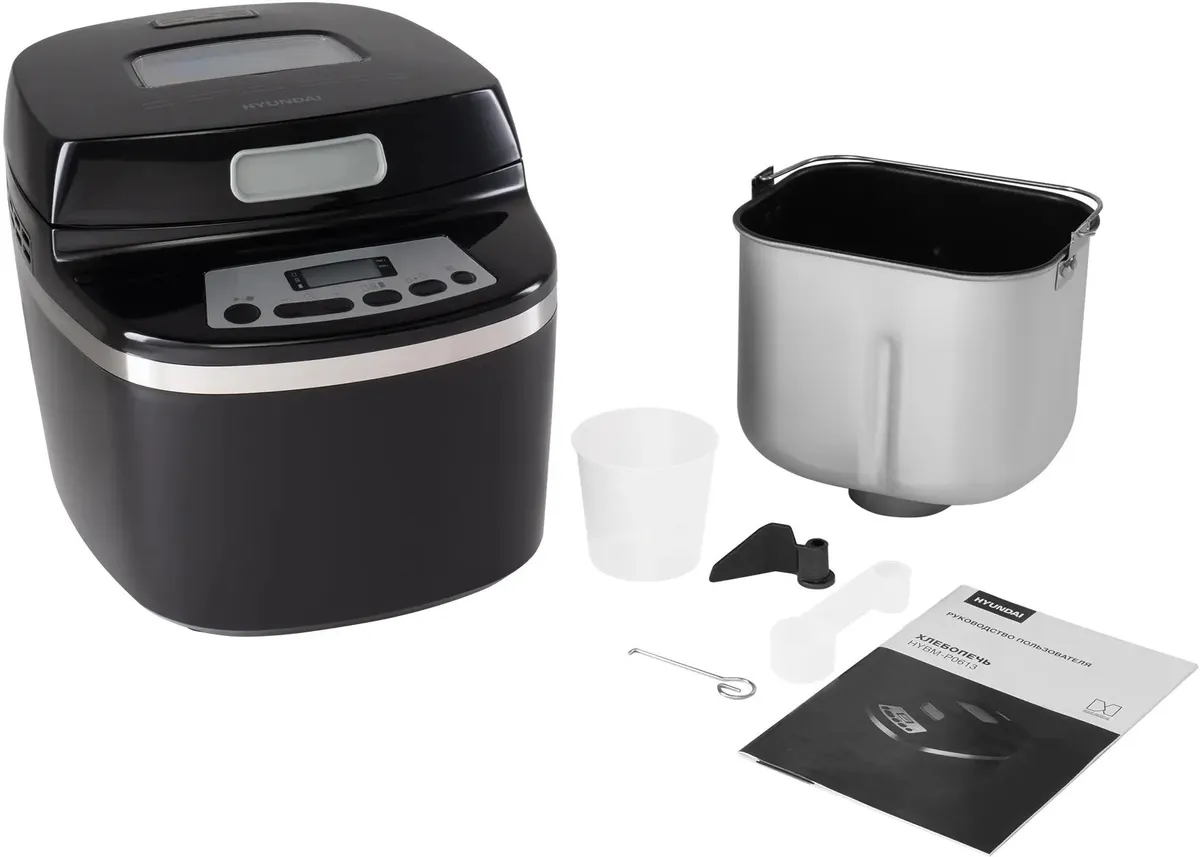 1 лопасть для замешивания теста, крюк для извлечения лопасти, мерная ложка, мерный стакан