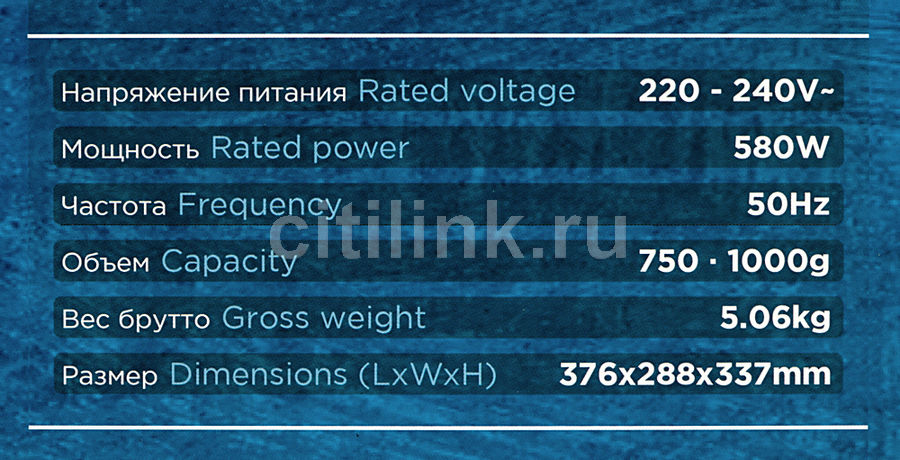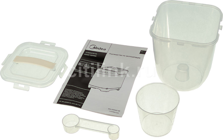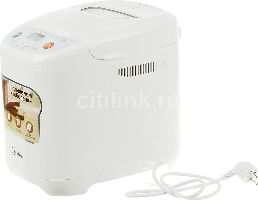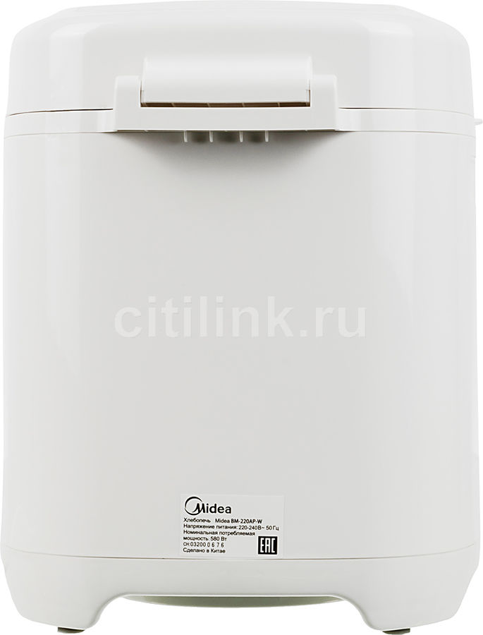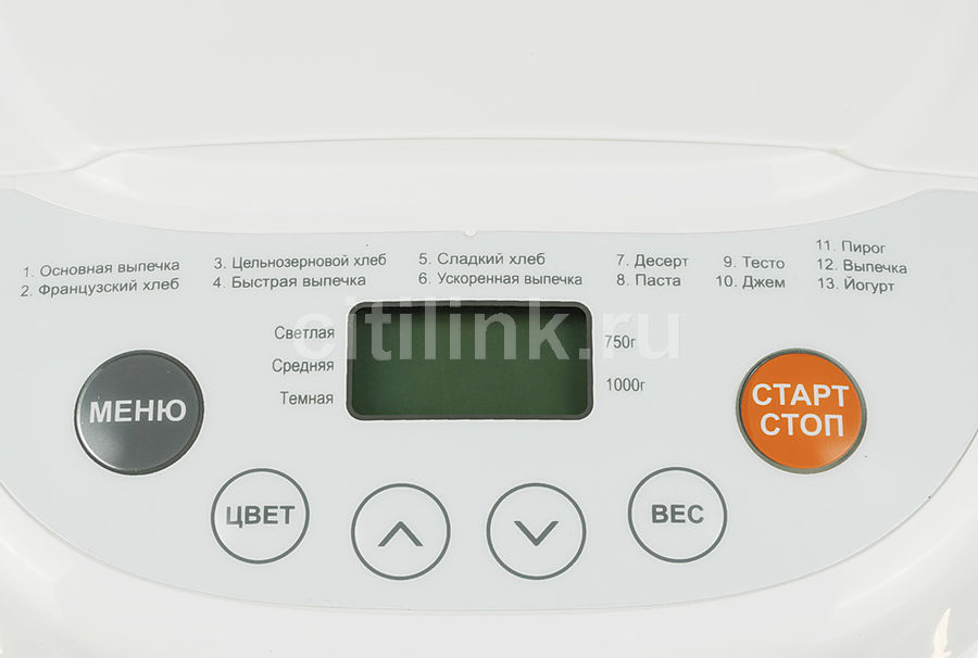 мощность 580Вт, вес выпечки 750/1000г, отсрочка старта 13ч, программ приготовления- 11, форма выпечки буханка, антипригарное покрытие, поддержание температуры, цвет- белый