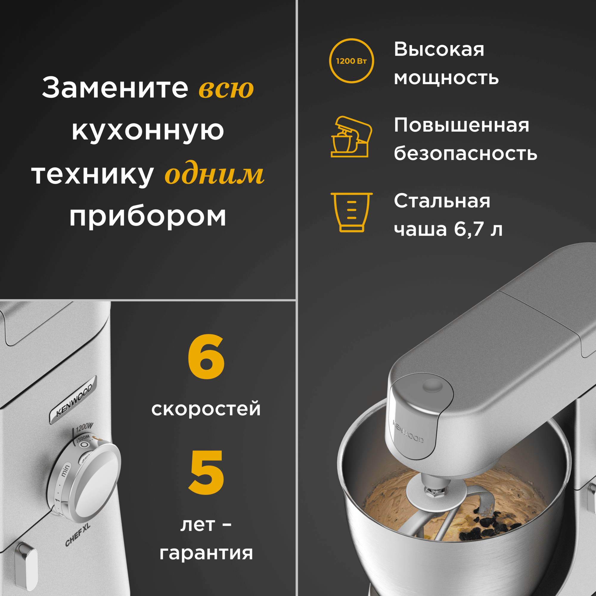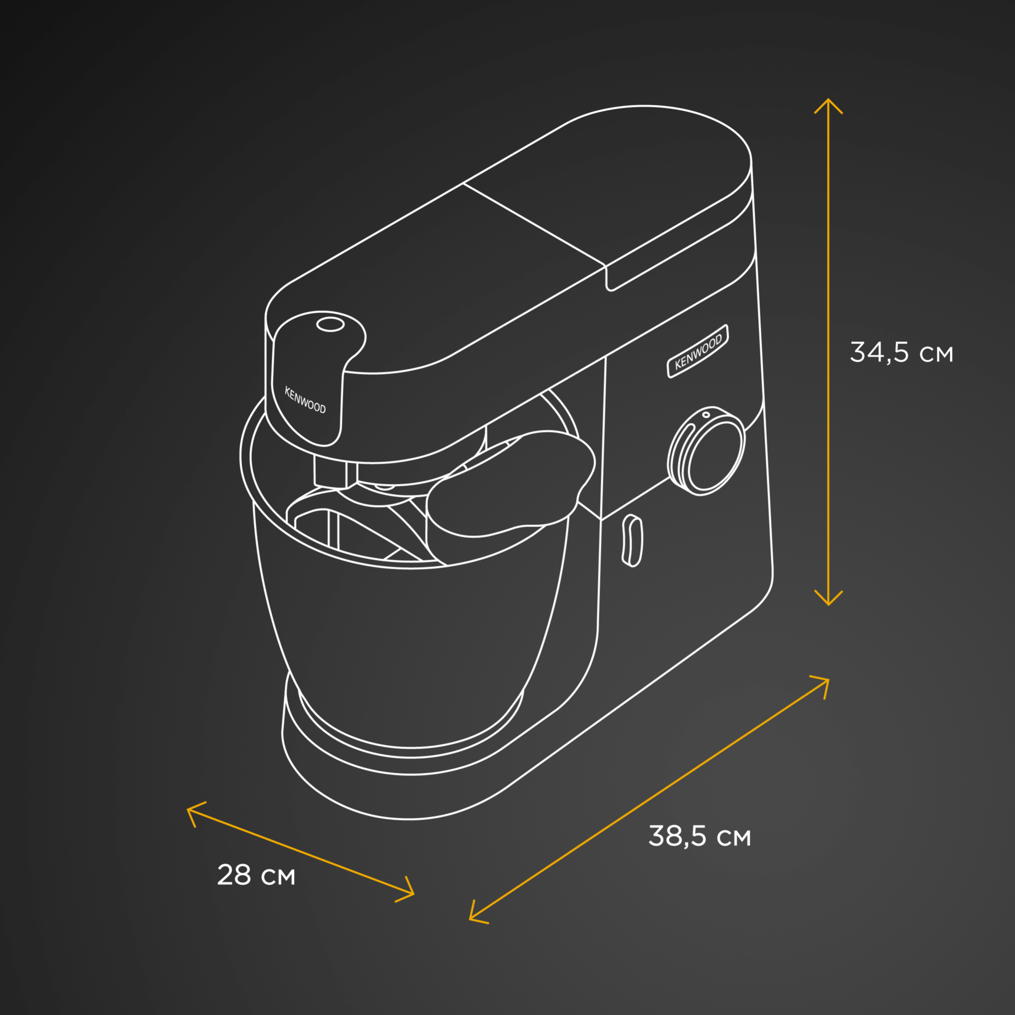 Кухонная машина Kenwood KVL4100S с электронной системой управления проста и удобна в использовании. Модель оснащена чашей объемом 6,7 л. За счет этого можно приготовить тесто весом до 4550 г. Световой индикатор сообщает о готовности устройства к работе. Кухонная машина оборудована тремя насадками, посредством которых можно использовать модель для смешивания как жидких, так и густых ингредиентов. Устройство имеет специальный кожух. Это упрощает процесс ухода за рабочей поверхностью и позволяет защитить одежду от брызг.