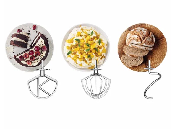 Кухонная машина, К-образная насадка, Крюк для теста, Венчик, Привод для подключения чаши, Привод для низкоскоростных насадок, Защитная крышка, Инструкция.