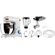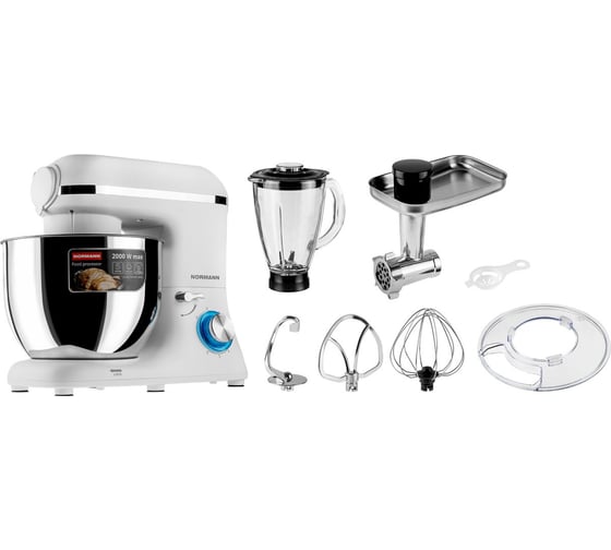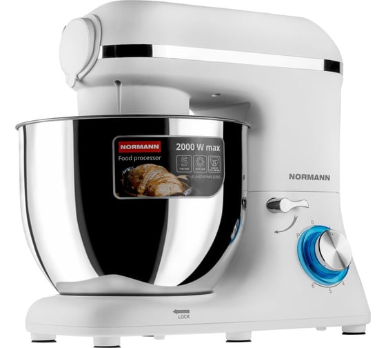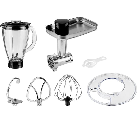 Миксер укомплектован тремя насадками: венчиком для взбивания, насадкой для перемешивания и крюком для теста. Перемешивание происходит в большой чаше (7 л), выполненной из нержавеющей стали и укомплектованной пластиковой защитной крышкой.