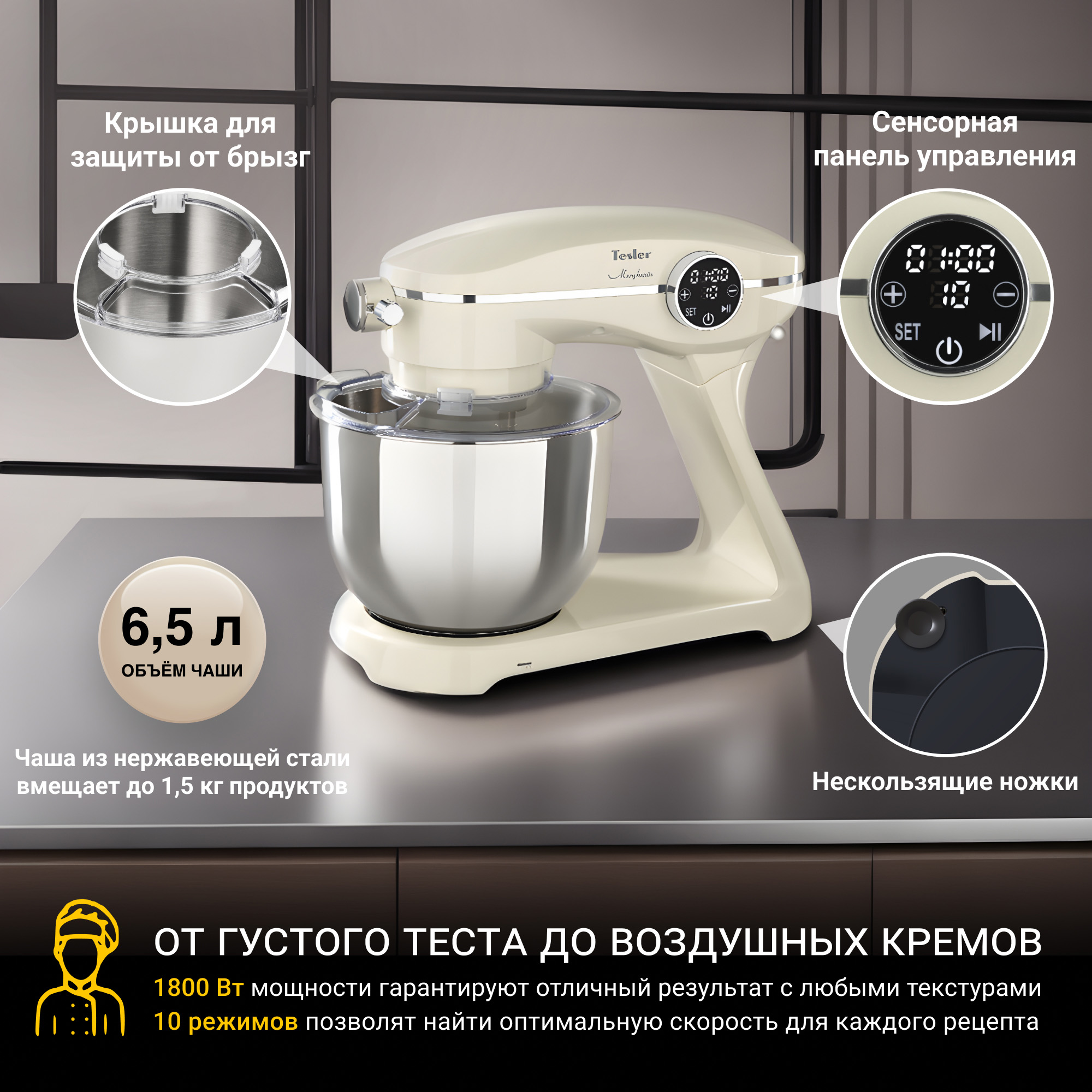 1800 Вт мощности гарантируют отличные результаты даже при замешивании густого теста. Плавный старт предотвращает разбрызгивание ингредиентов при старте машины на высокой скорости.