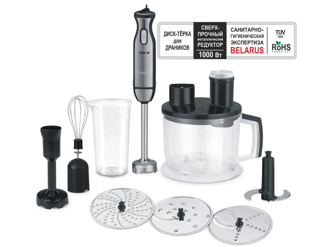 Чаша для измельчения (объём 1,75 л); Нож для измельчения; Насадка-блендер; Мерный стакан для смешивания (объём 0,6 л) с крышкой; Венчик для взбивания; Насадка для приготовления пюре; Диск-тёрка для драников; Двусторонний диск для тёрки и крупной нарезки; Двусторонний диск для шинковки и мелкой нарезки; Инструкция; Гарантийный талон