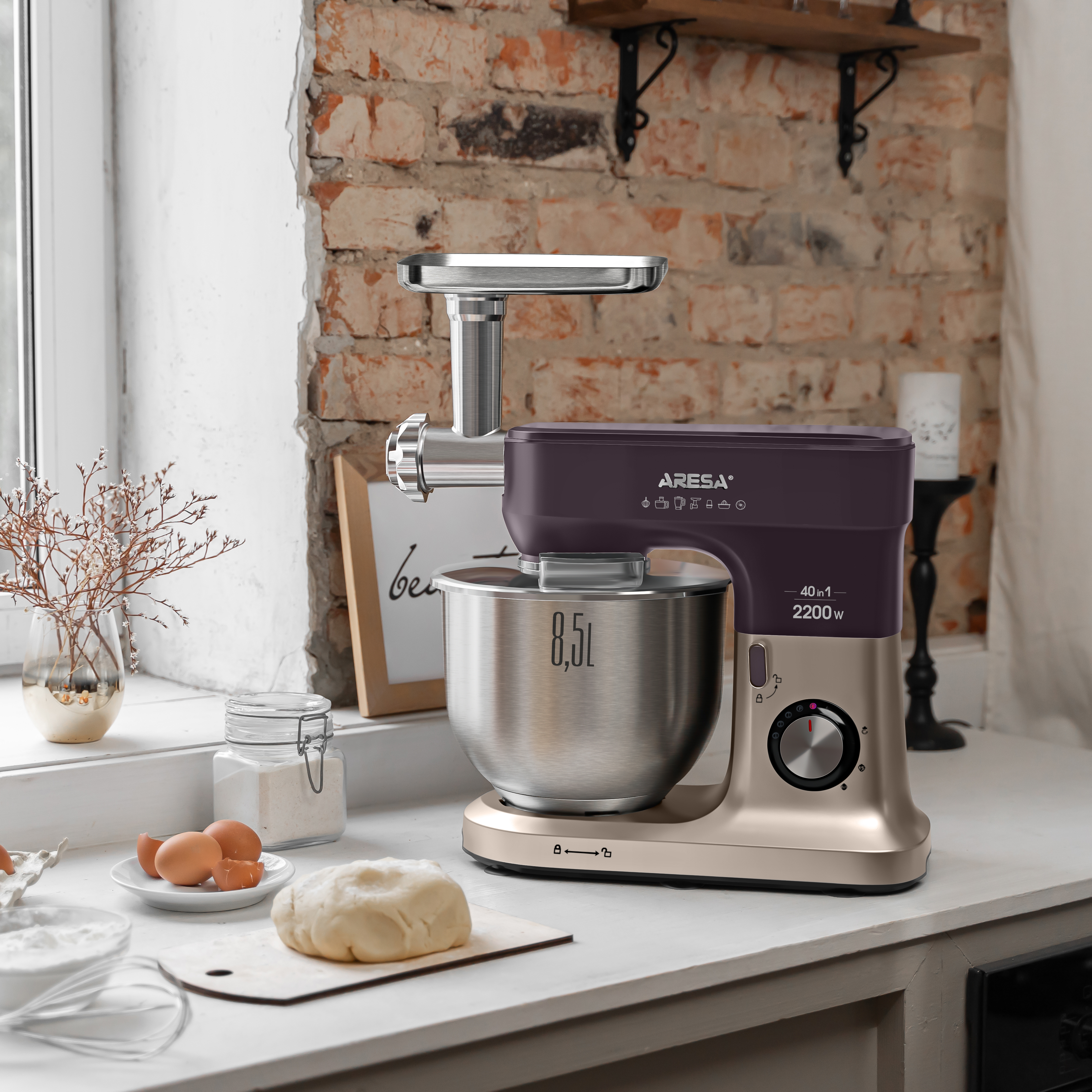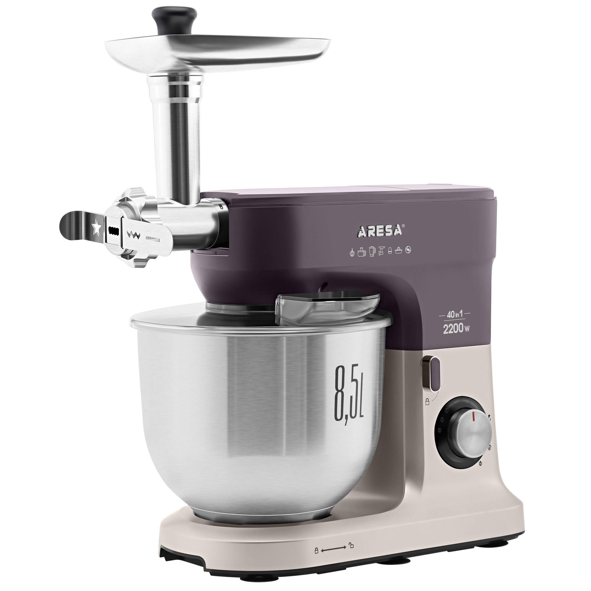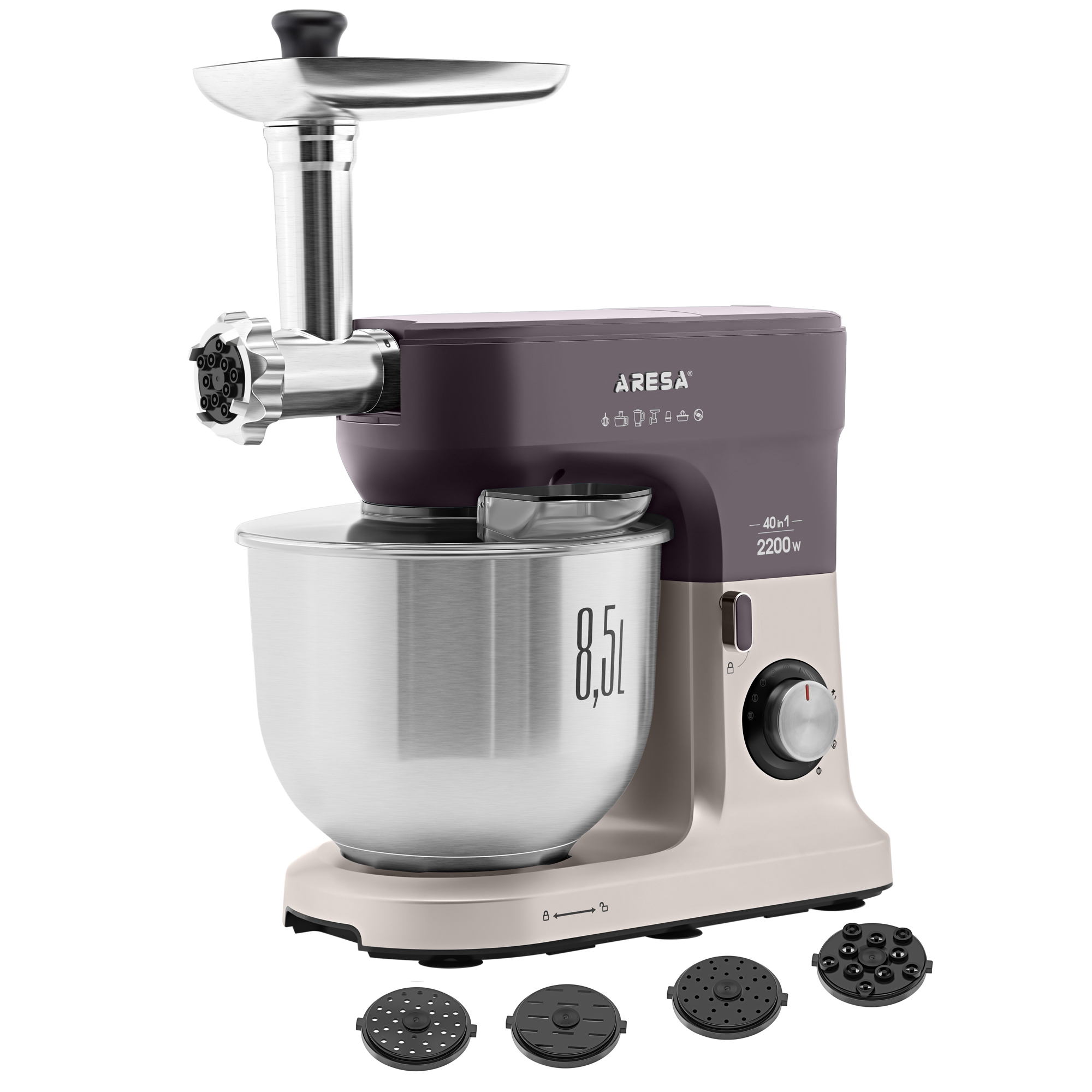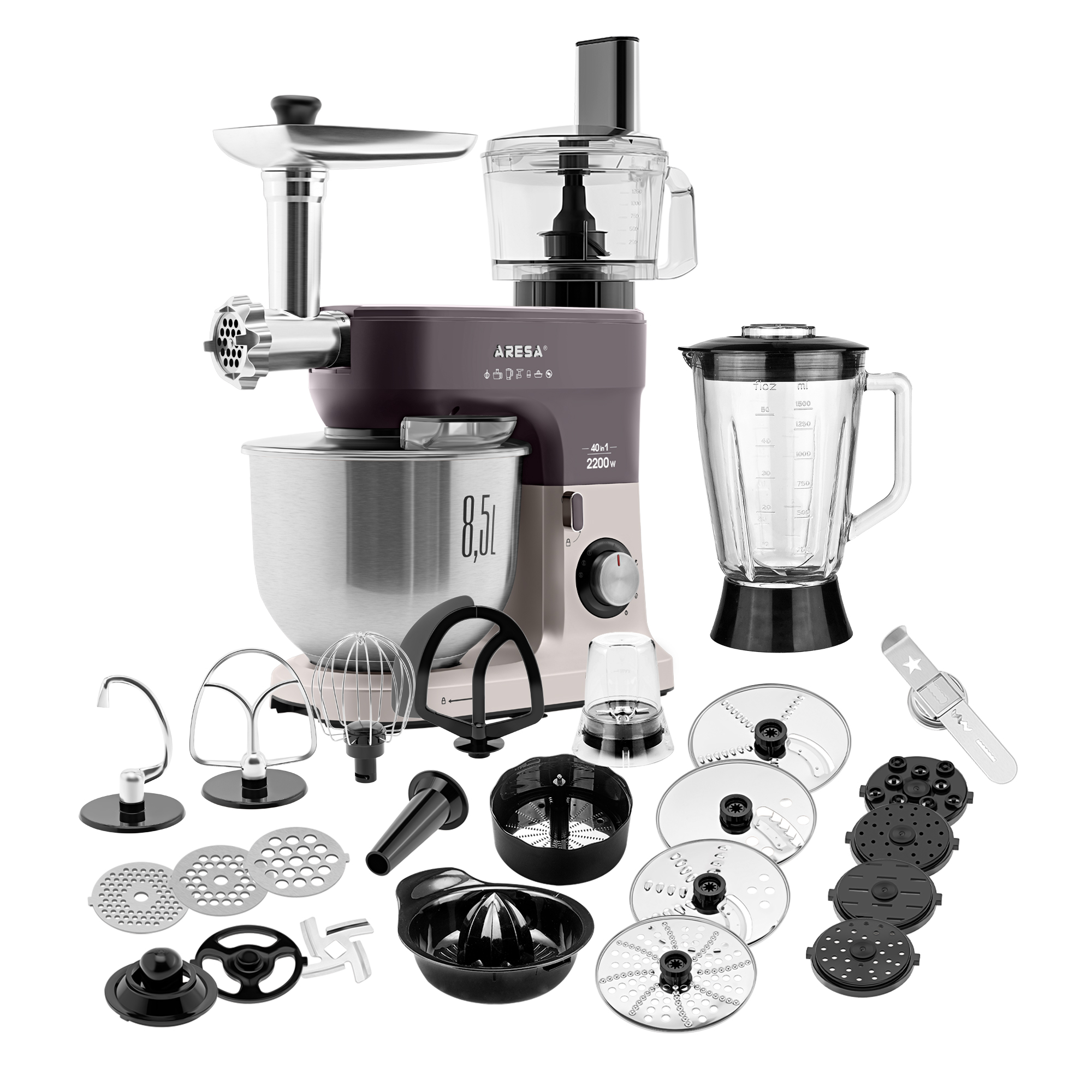 Функции: миксер, мясорубка, блендер, измельчитель, кофемолка, соковыжималка (цитрусовая, центрифужная), приготовление печенья, макарон (4 формы)
