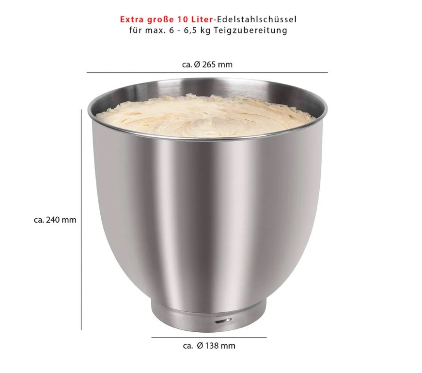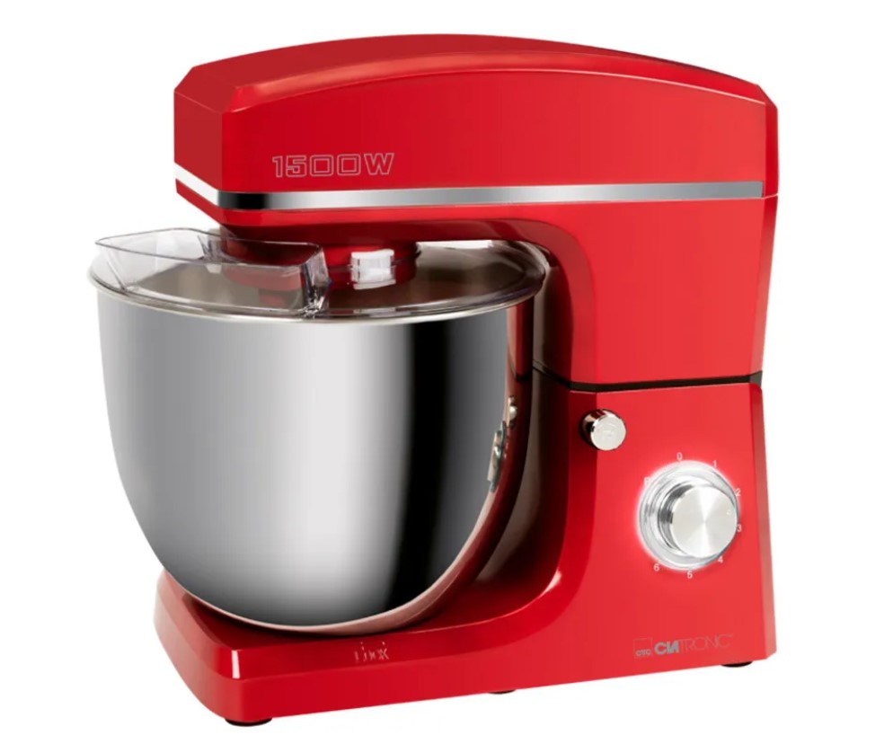 Компания Clatronic предлагает планетарный миксер внушительных объемов, который подойдет для домашнего производства или готовки на большую семью. Его главная особенность — это чаша объемом 10 литров, в которой за раз можно замесить до 6.5 килограммов теста. Сделана она из прочной нержавеющей стали и дополнена прозрачной крышкой-брызговиком, с помощью которой можно контролировать процесс смешивания и добавлять ингредиенты. Также чистоту на кухне сохраняет плавность пуска и регулировки скоростей, чтобы мука не разлетелась по поверхности, а жидкость не разбрызгалась по стенам. А еще плавный пуск защищает мотор Clatronic KM 3765 от максимальных нагрузок, постепенно наращивая обороты. Кстати, для такой серьезной машины предусмотрен двигатель мощностью 1500 Вт, который обеспечивает стабильную работу и позволяет справиться с большими объемами и твердыми и вязкими массами, а в сложных случаях на помощь придет импульсный режим. Вместе с миксером в комплекте идут крюк для теста, венчик и биттер (лопатка) для перемешивания.