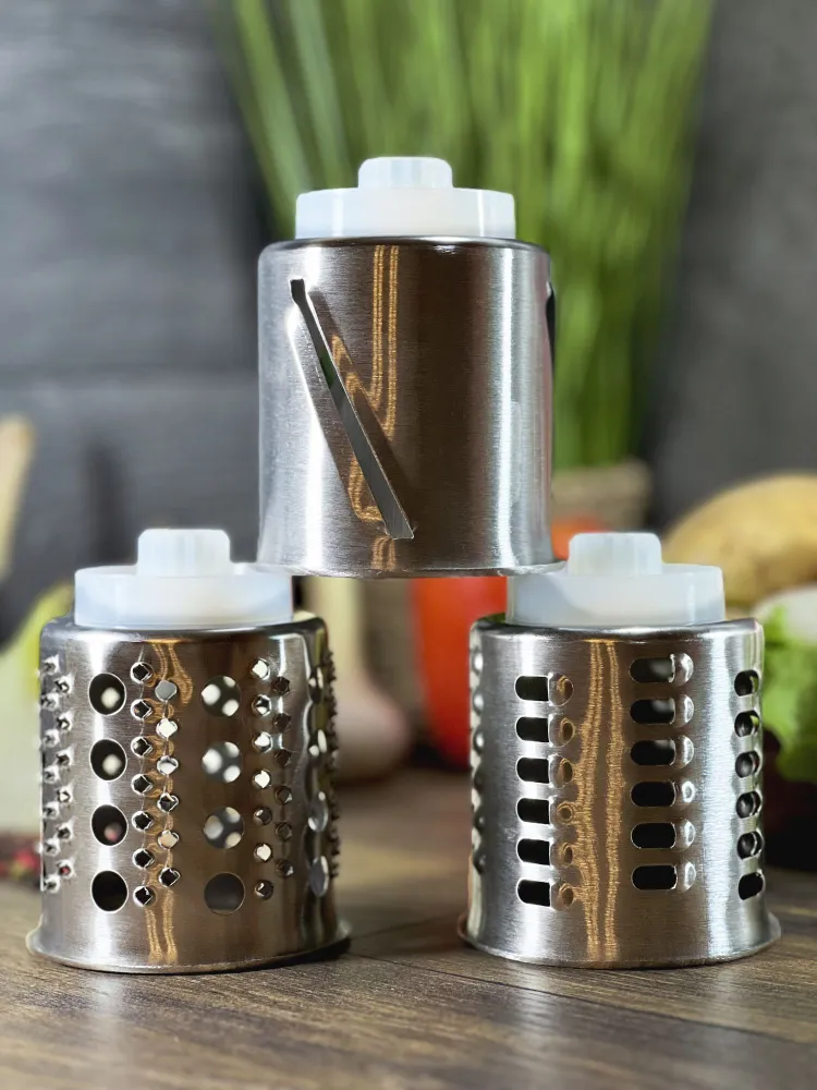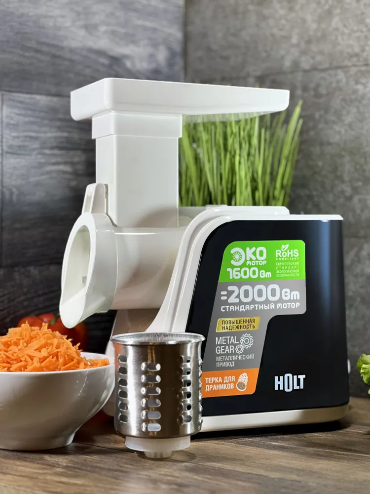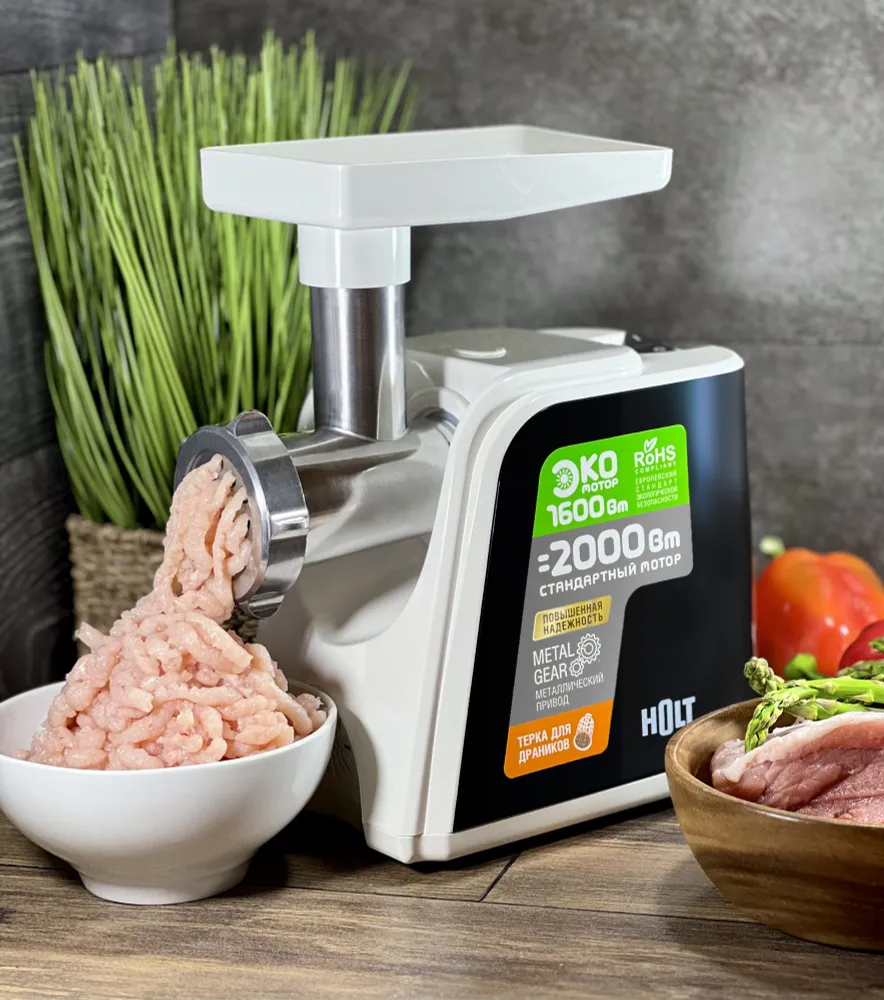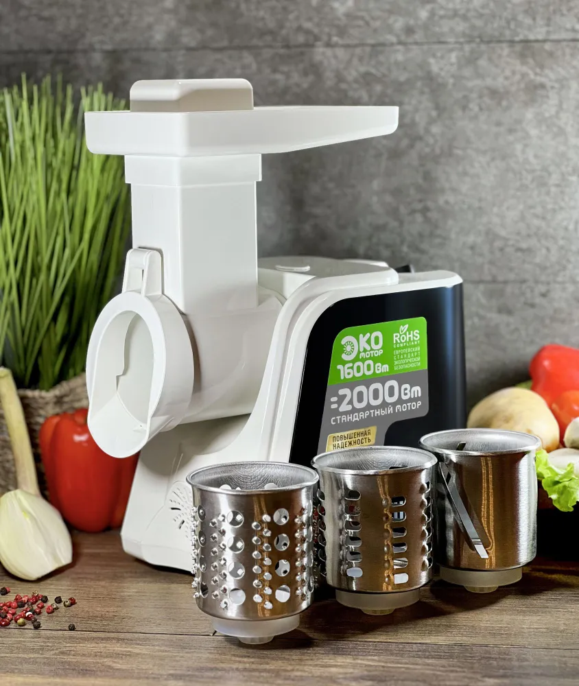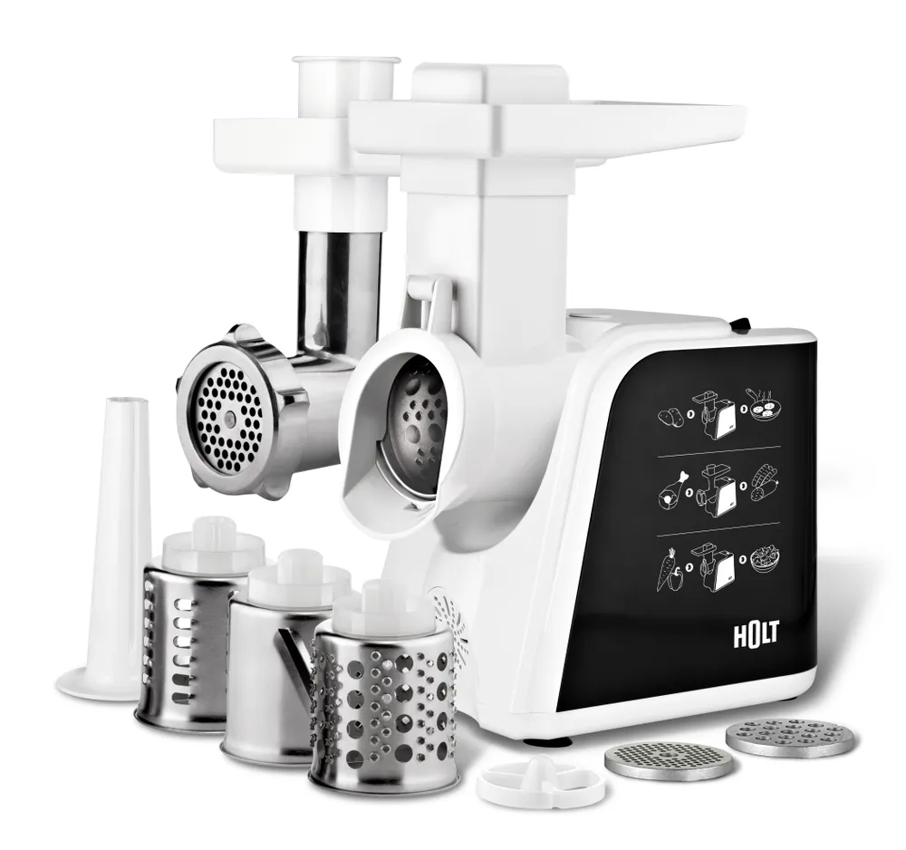 Кухонный комбайн - 1шт., решетка мелкая - 1шт., решетка средняя - 1шт., насадка для кебаба - 1шт., насадка для домашней колбасы - 1шт., терка для драников - 1шт., терка крупная- 1шт., насадка для шинкования - 1шт., упаковка.