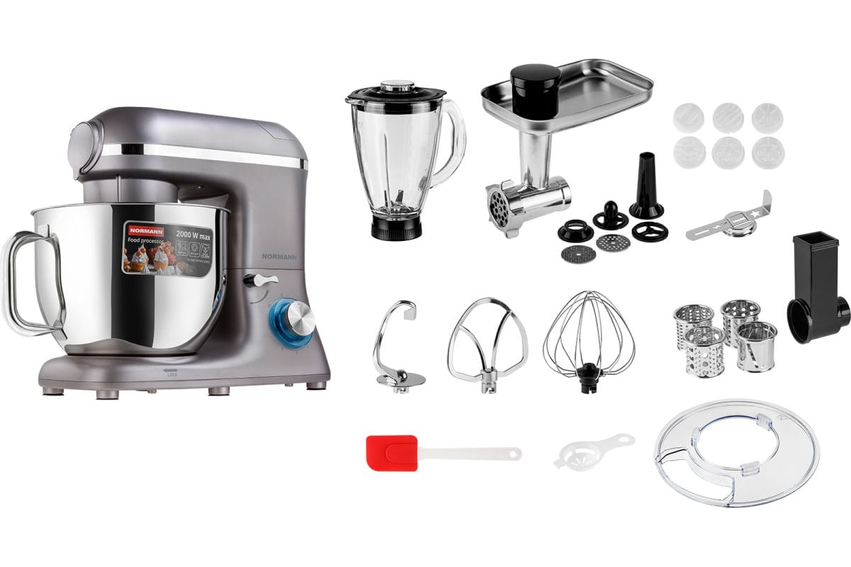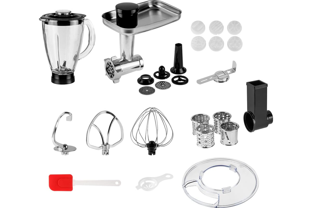 Насадка-крюк для теста, Насадка для замешивания, Насадка-венчик, Решетки для мясорубки (3/5/7 мм), Насадки для овощерезки (4 шт.), Насадка для колбас, Насадка для кеббе, Насадки для макарон (6 шт.), Насадка для печенья