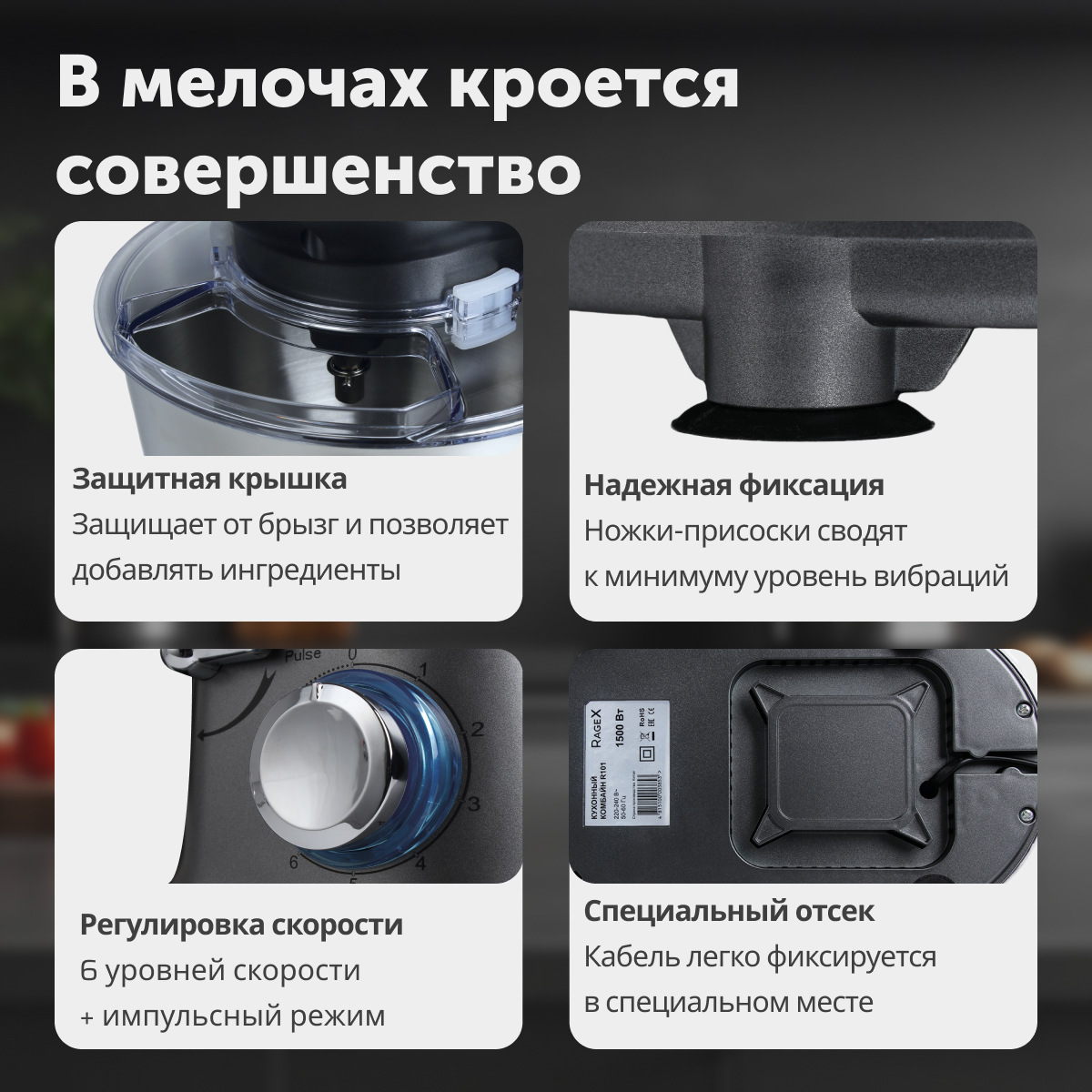 Комбайн кухонный, насадки (крюк для теста, плоский битер, венчик для взбивания), чаша металлическая, чаша блендера, мясорубка с 3 решетками и 1 ножом, металлический лоток для мясорубки, инструкция по использованию кухонного комбайна с мясорубкой, плотная упаковка для комбайна.
