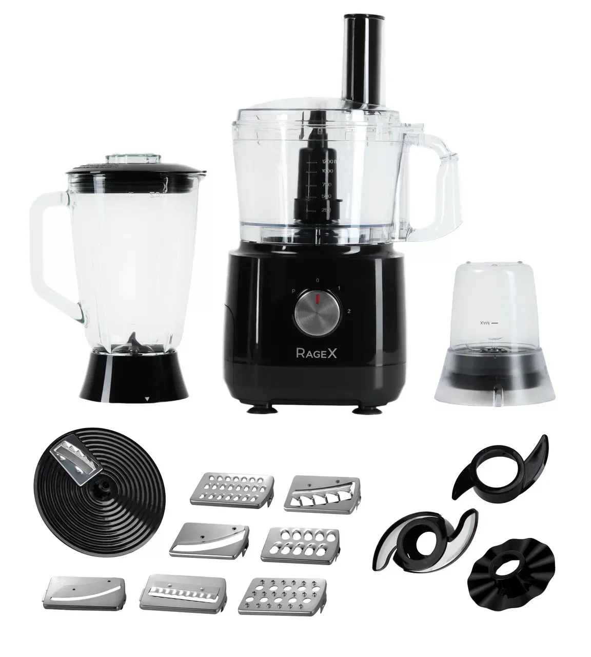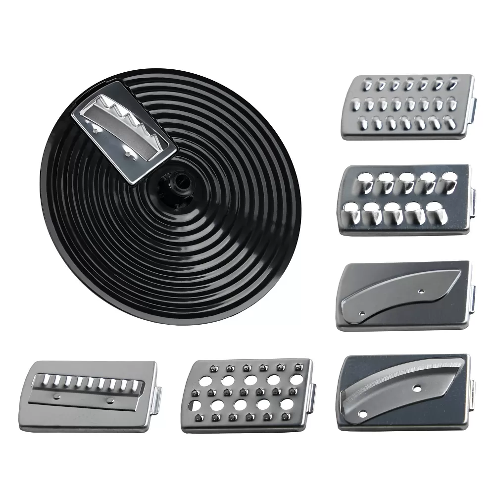 • Набор лезвий для нарезки – 7 шт (волнообразное лезвие, для нарезки тонких ломтиков, для нарезки толстых ломтиков, для нарезки картофеля фри, для нарезки тонкой соломки, для нарезки толстой соломки, для измельчения);