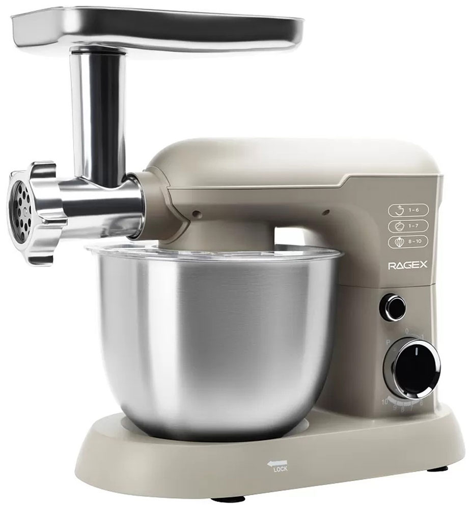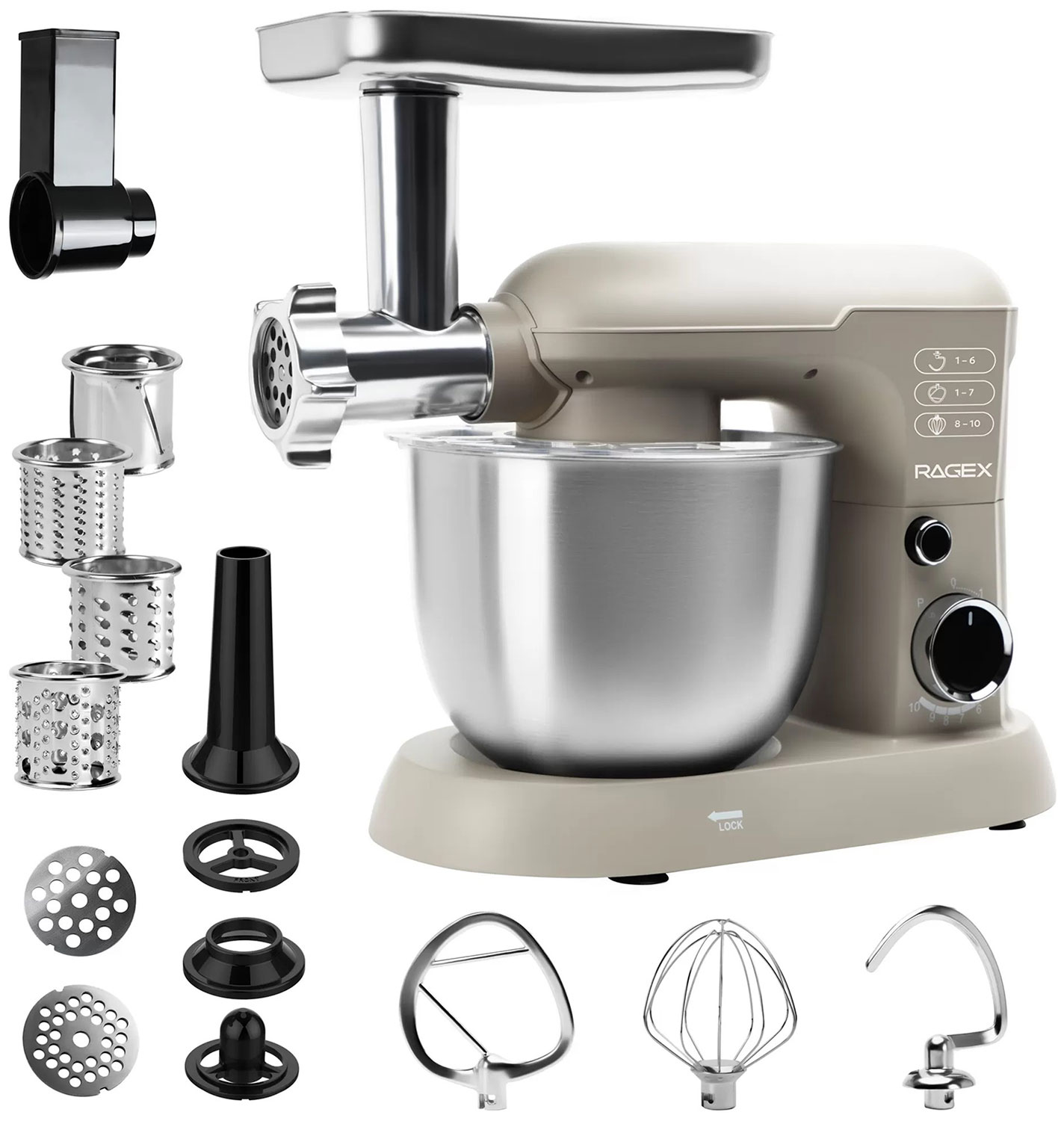 Многофункциональный кухонный комбайн R106-110 11 в 1 заменит сразу несколько бытовых электрических приборов. Он сочетает в себе функции планетарного миксера, мясорубки, овощерезки и тестомеса.