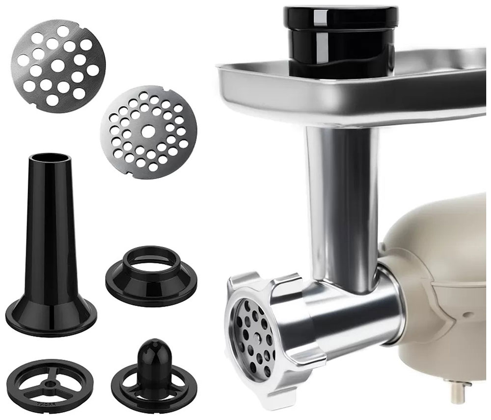Насадки: крюк для теста, плоский битер, венчик для взбивания, насадка для сосисок, насадка для колбасок «кеббе», мелкая терка, крупная терка, слайсер, терка для драников