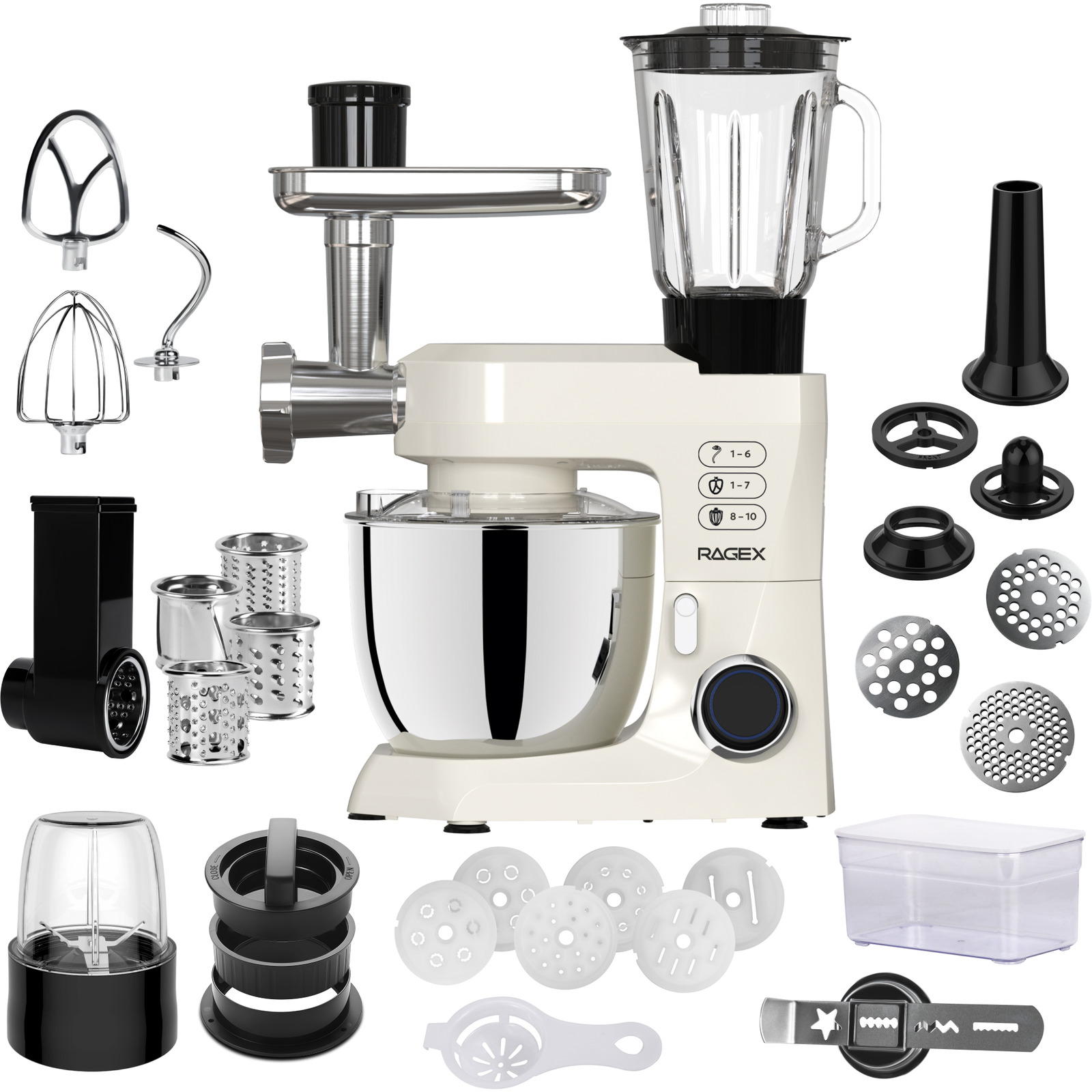 Насадка для сосисок, насадка для колбасок «кеббе», разделитель для колбасок «кеббе» Овощерезка (корпус овощерезки, толкатель, мелкая терка, крупная терка, слайсер, терка для драников (мелкая)) Сепаратор для яиц Насадка для печенья