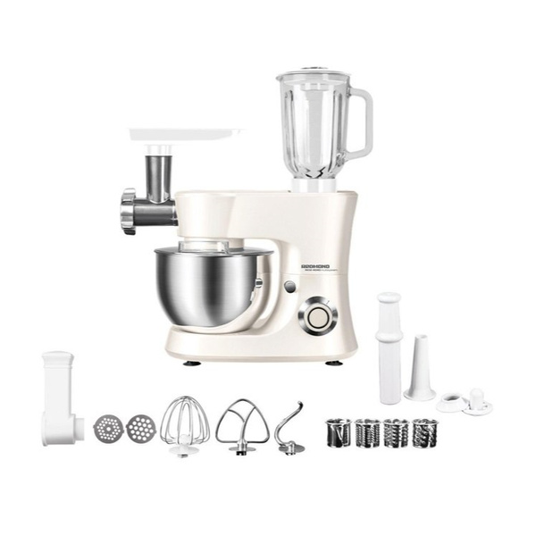 Аксессуары | венчик для взбивания насадка / крюк для замеса теста лопатка для перемешивания (биттер) 2 диска для фарша насадка для кеббе насадка для домашних колбас 4 насадки для нарезки/шинковки |