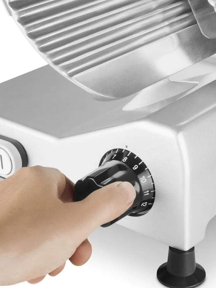 Прочный металлический корпус слайсера и регулируемые нескользящие ножки гарантируют исключительную устойчивость даже при нарезке самых твердых продуктов.