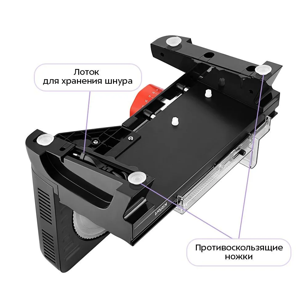Ломтерезка оснащена противоскользящими ножками для устойчивости на поверхности. На дне предусмотрено отверстие для хранения шнура питания, что удобно при перемещении и хранении устройства.