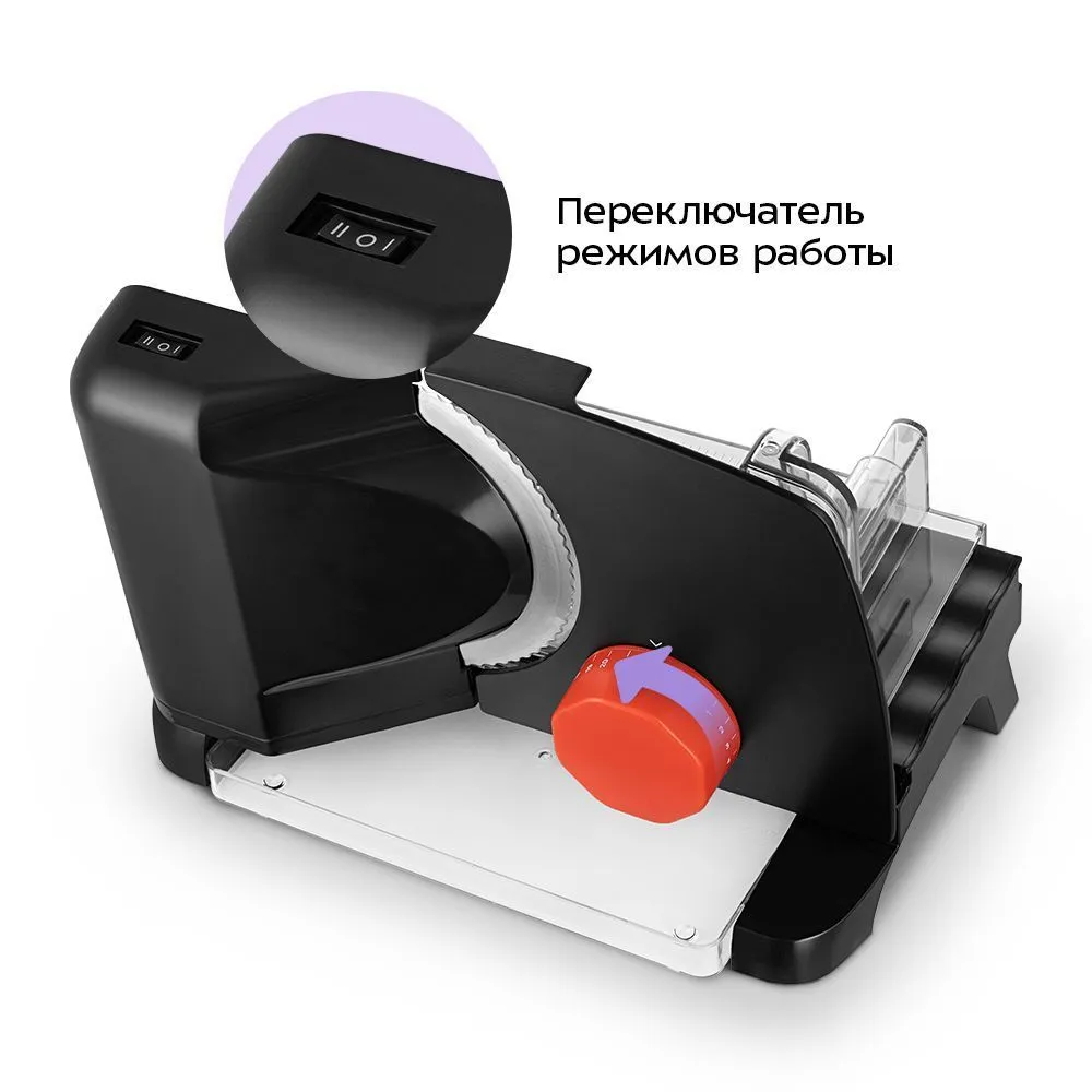 С помощью ломтерезки вы заметно сократите время нарезки и получите ровные ломтики, добиться которых обычным ножом очень непросто. Толщина нарезки определяется зазором между дисковым ножом и ограничителем. Толщину ломтиков можно регулировать от 1 до 22 мм