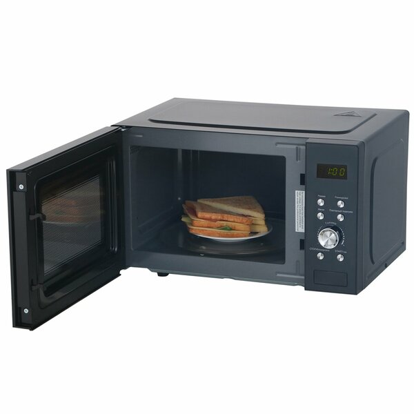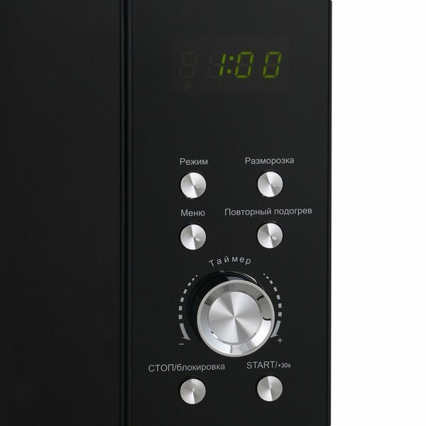 Печь оснащена стеклянным поворотным блюдом диаметром 25,5 см. Стенки камеры покрыты лаком, поверхность легко очищается от загрязнений. Дверь открывается налево с помощью клавиши. Полезный объем внутреннего пространства — 23 л. По окончании приготовления раздается звуковой сигнал. Вес модели — 12 кг.