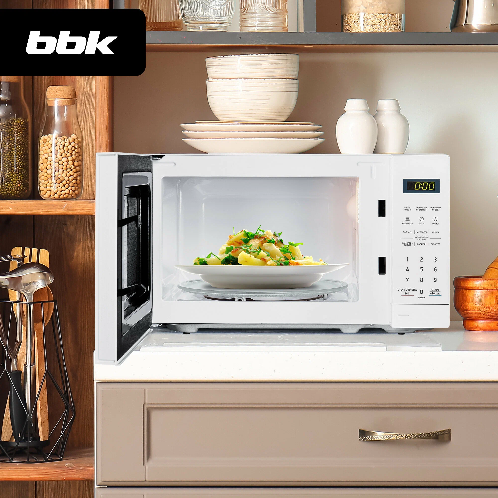 комплектация: микроволновая печь, стеклянный поворотный стол, роликовая подставка, коплер, руководство по эксплуатации, гарантийный талон
