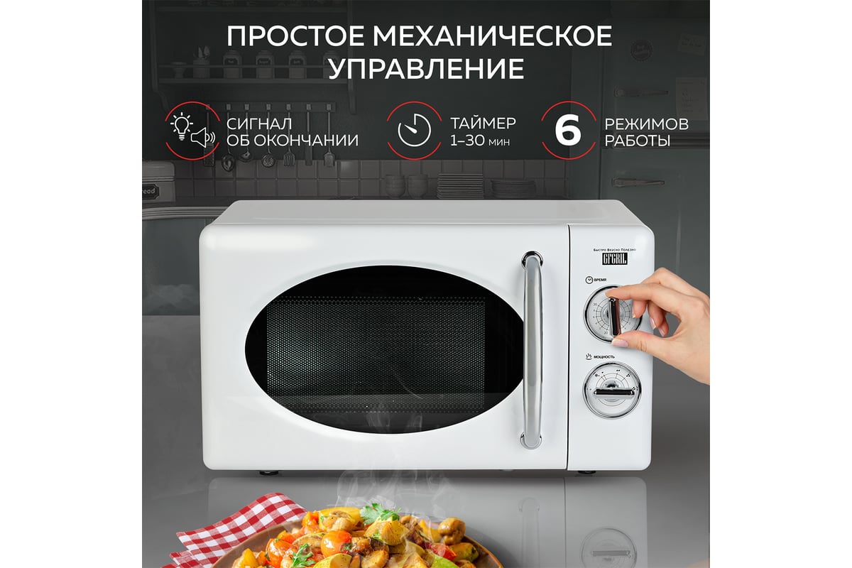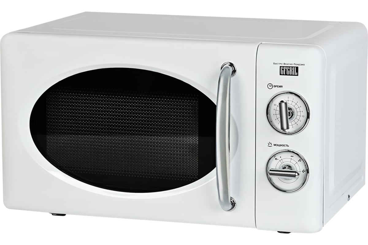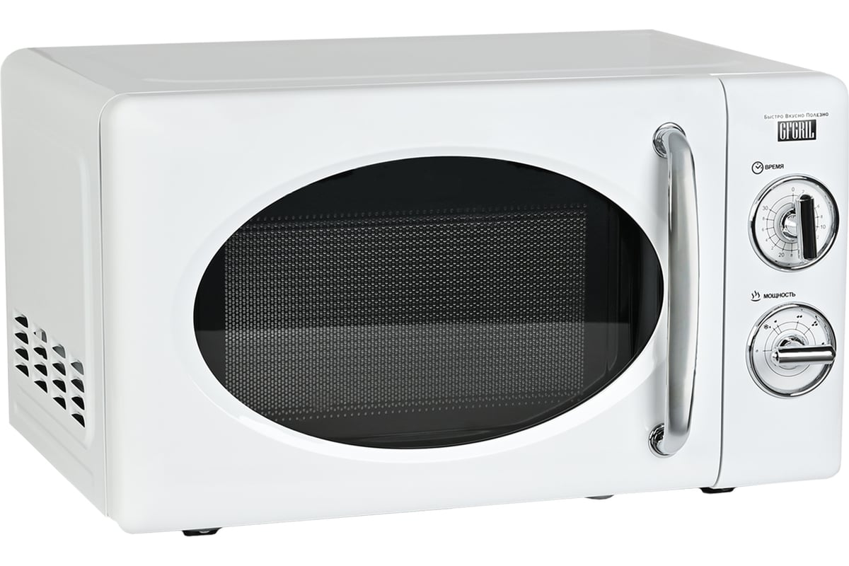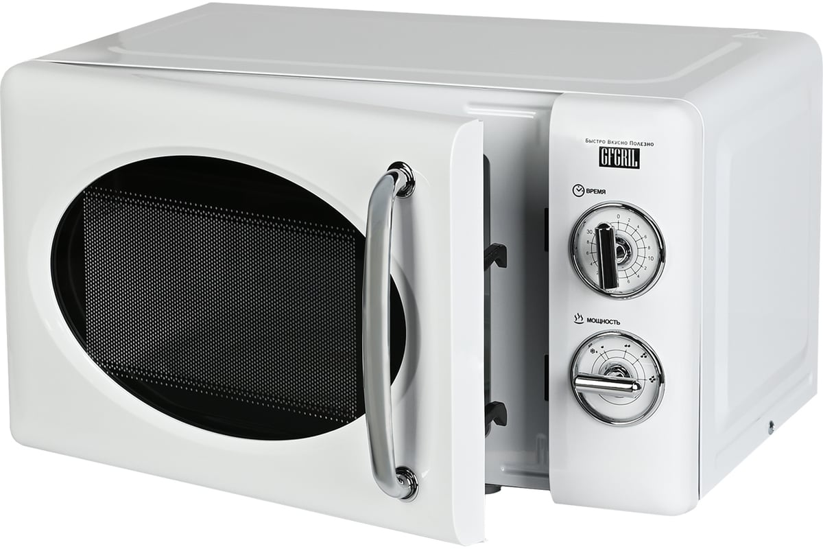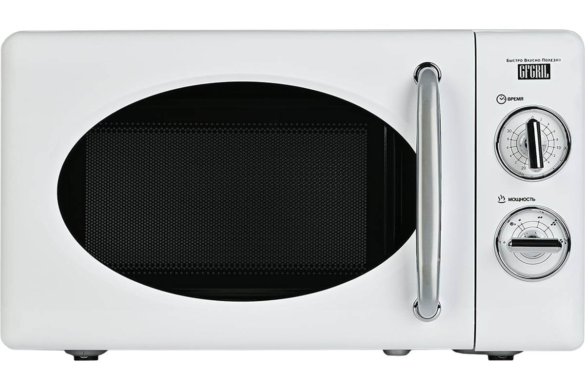 Микроволновая печь GF-MWO203-white предназначена для быстрого приготовления, подогрева различных блюд и напитков, а также для размораживания продуктов. Микроволновка СВЧ выполнена в ретро стиле в классическом белом цвете. Качественное исполнение и широкие функциональные возможности сделают эту модель украшением Вашей кухни, а стильные хромированные поворотные регуляторы, ручка дверцы и необычная овальная форма смотрового окошка на дверце, подчеркивают оригинальный внешний вид микроволновой печи.