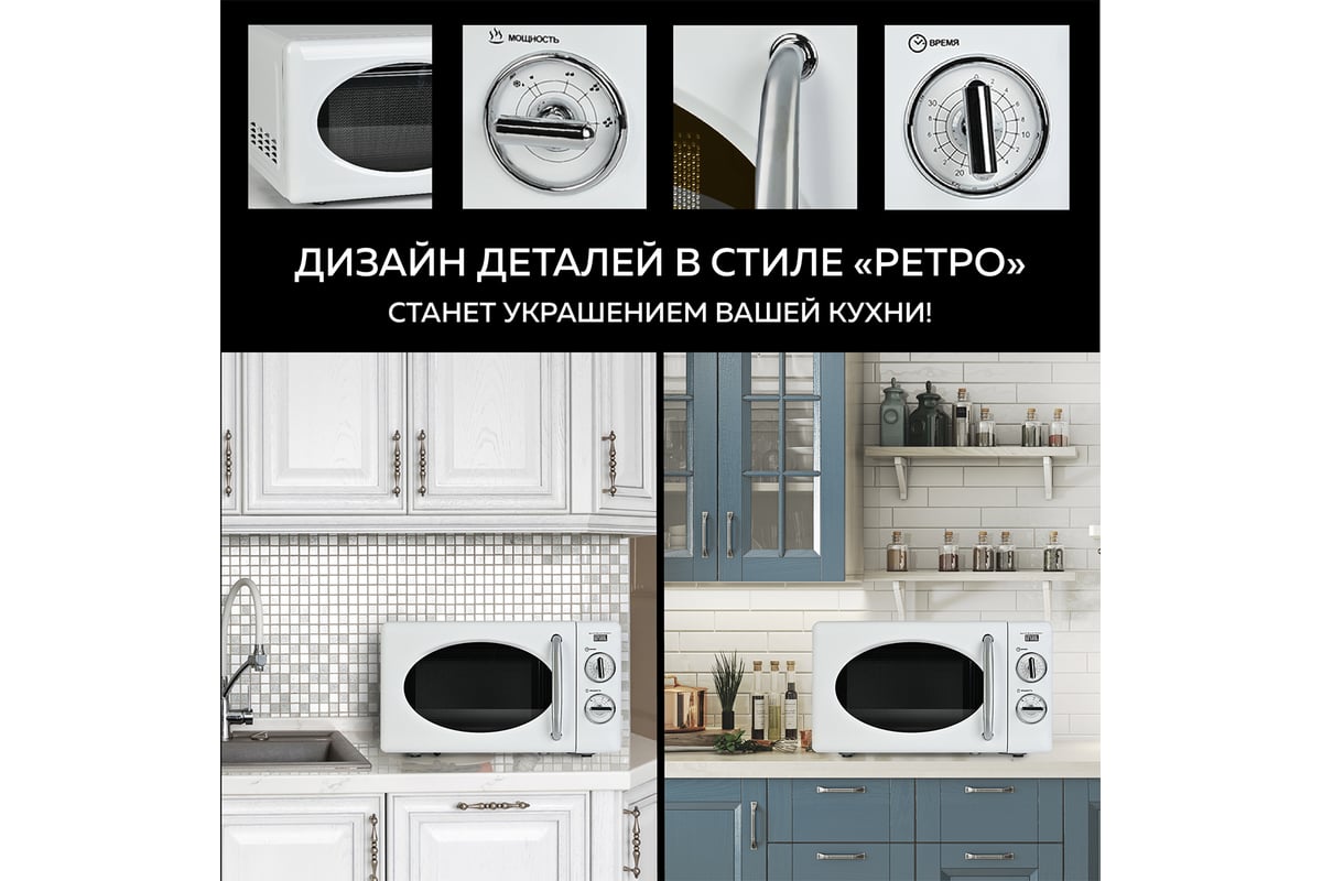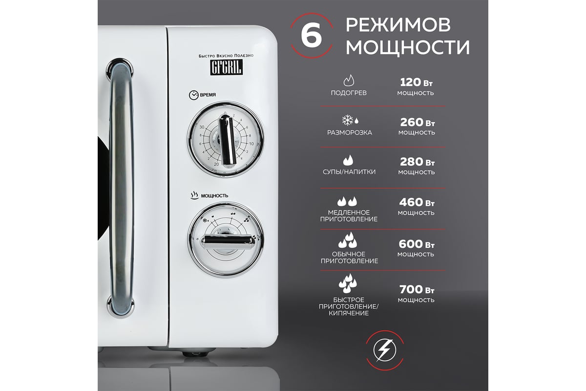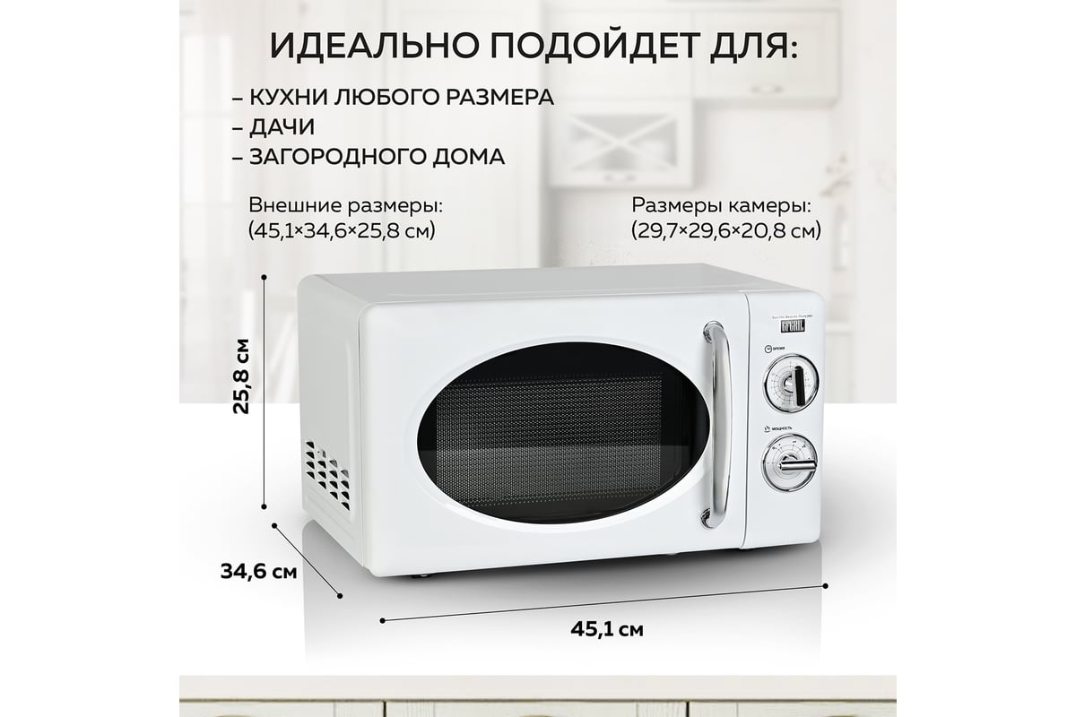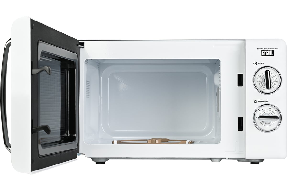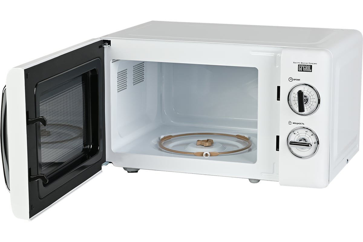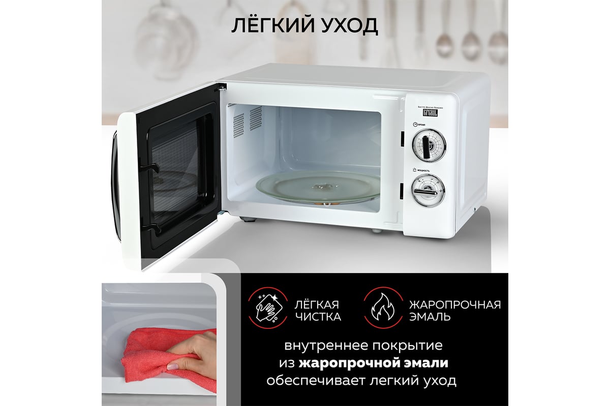 Микроволновая печь GF-MWO203-white предназначена для быстрого приготовления, подогрева различных блюд и напитков, а также для размораживания продуктов. Микроволновка СВЧ выполнена в ретро стиле в классическом белом цвете. Качественное исполнение и широкие функциональные возможности сделают эту модель украшением Вашей кухни, а стильные хромированные поворотные регуляторы, ручка дверцы и необычная овальная форма смотрового окошка на дверце, подчеркивают оригинальный внешний вид микроволновой печи.