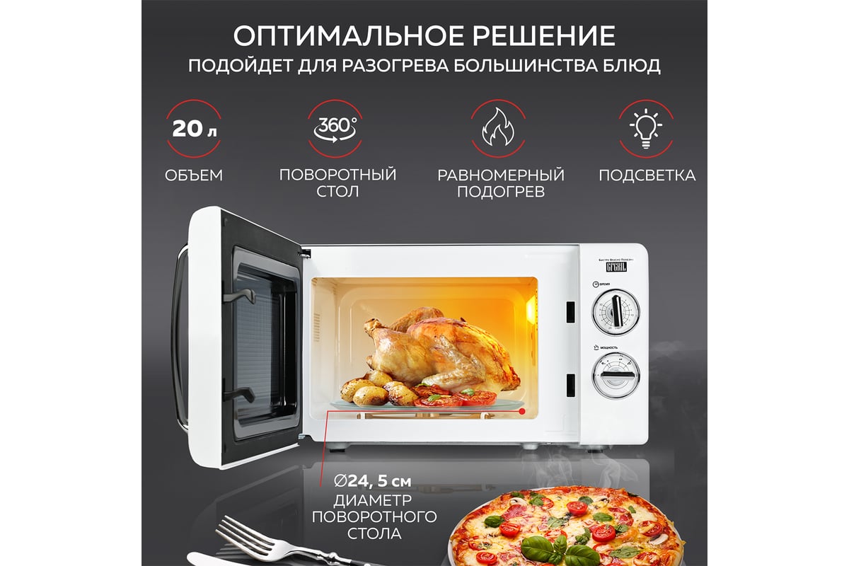 Благодаря оптимальному размеру (297*296*208 мм) и объему внутренней камеры 20 литров, а так же мощности 700 Вт и частоте микроволн 2450 МГц СВЧ печь позволит Вам быстро и равномерно разогреть блюда или разморозить продукты. Печь микроволновая имеет эмалевое покрытие внутренней камеры, которое не впитывает запахи и устойчиво к появлению царапин, легко очищается от загрязнений - достаточно просто протереть внутреннюю поверхность салфеткой или губкой после использования. Вы можете выбрать один из 6 уровней мощности и установить время приготовления или разогрева от 1 до 30 минут при помощи механических поворотных регуляторов, а встроенная подсветка позволит наблюдать за процессом, не открывая дверцу.По истечении установленного времени таймер оповестит Вас об окончании процесса приготовления звуковым сигналом. Микроволновка СВЧ имеет оптимальный размер (451*346*258 мм) и независимую конструкцию, что позволяет разместить ее в любом удобном месте на Вашей кухне.