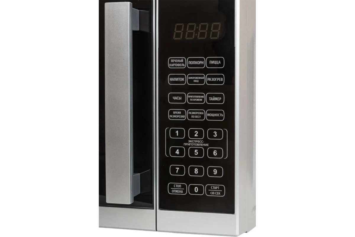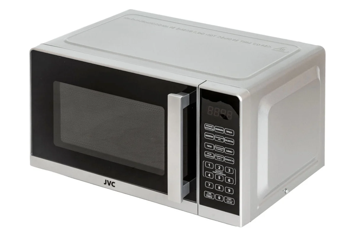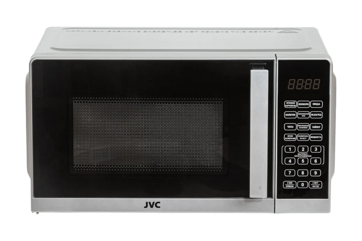 Микроволновая печь JVC JK-MW372S с таймером до 99 минут, 10 уровнями мощности, 6 программами автоматического приготовления, электронными часами, размораживанием по весу и времени, с цифровым управлением быстро и эффективно разогреет, разморозит или приготовит продукты для вашего стола